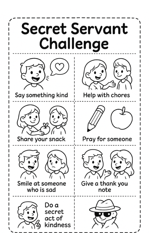 - Secret Servant Challenge Cards (cut-out kindness slips)