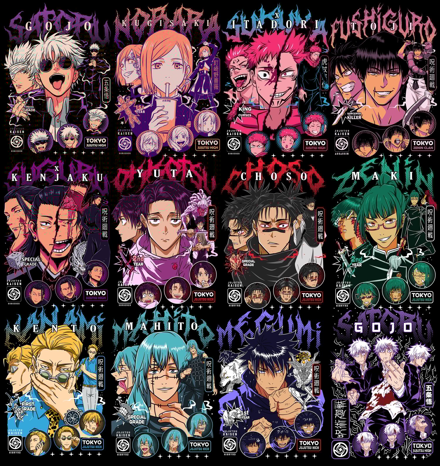Diseño digital en alta resolución, inspirado en la fuerza, el estilo y la oscuridad de los personajes más icónicos de Jujutsu Kaisen: Yuta, Itadori x Sukuna, Toji, Geto x Kenjaku, Choso, Megumi, Mahito, Maki, Nanami, Gojo, Nobara.