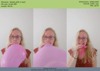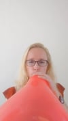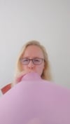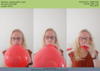 Natalie takes on 2 bright colored heart balloons until they pop.