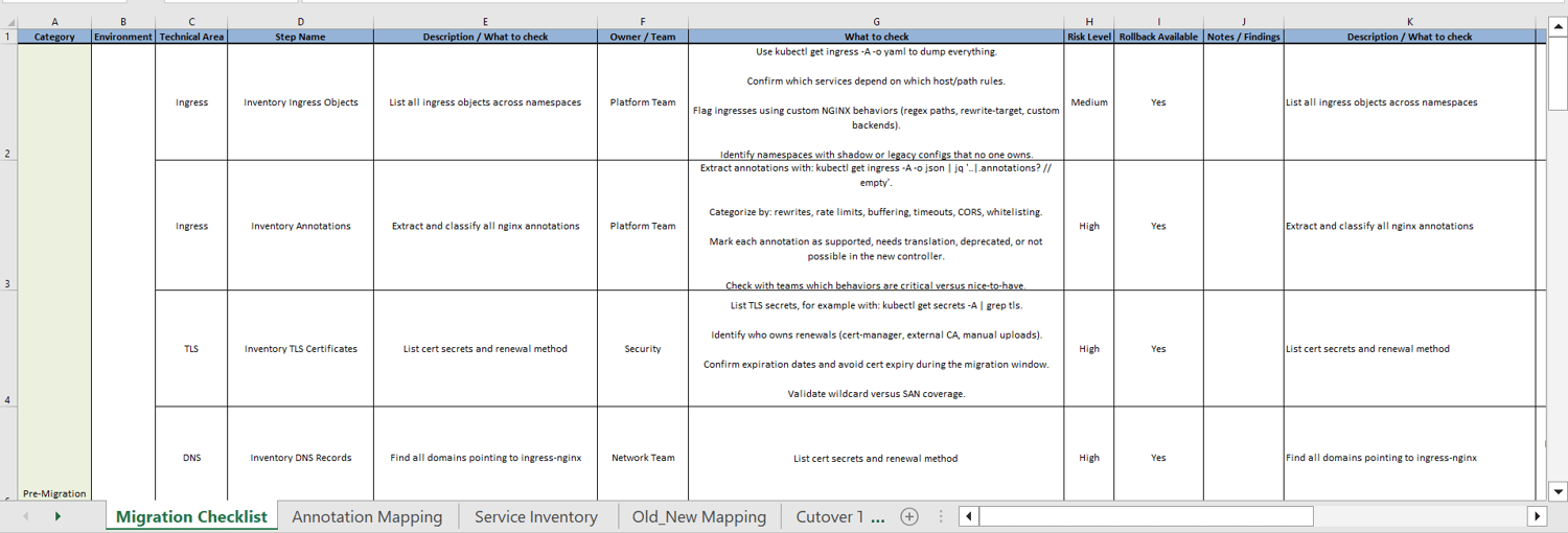 Migrating off ingress-nginx is a lot more work than it looks, and building a proper plan from scratch burns hours you don’t have. That’s why I created this fully structured migration checklist, a clear, practical Excel workbook you can adapt instantly to your own cluster.