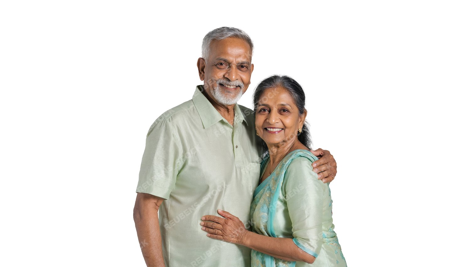 Indian Senior Couple Embracing Each Other Against a Plain White Background. Retirement Concept.