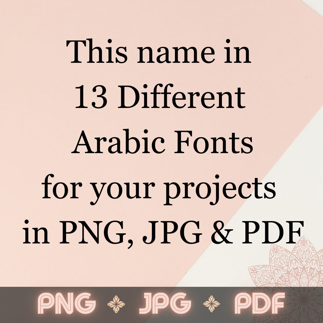 In this listing, you will receive the name in Arabic Calligraphy in 13 different fonts. You can use them to print out and hang in frames, for your digital personal work or even for your crafts. If you would like a custom name in 13 fonts, choose the listing on our shop and inshallah I will email you your file in 3 days time.