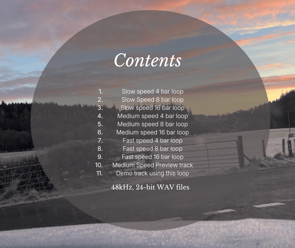 I have also included a 4 bar preview file and a demo track where I added the bilateral road noise to an ambient music track. The length of the demo track is 1min 30 secs.
