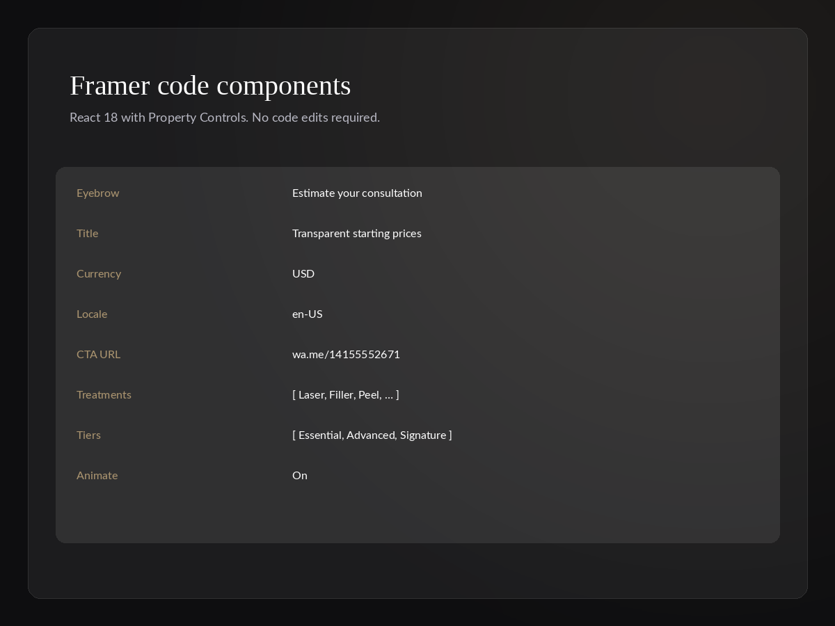 - 3 Conversion Widgets (Pricing Estimator, Before/After Slider, Sticky Booking Bar) in vanilla HTML/CSS/JS and Framer React 18