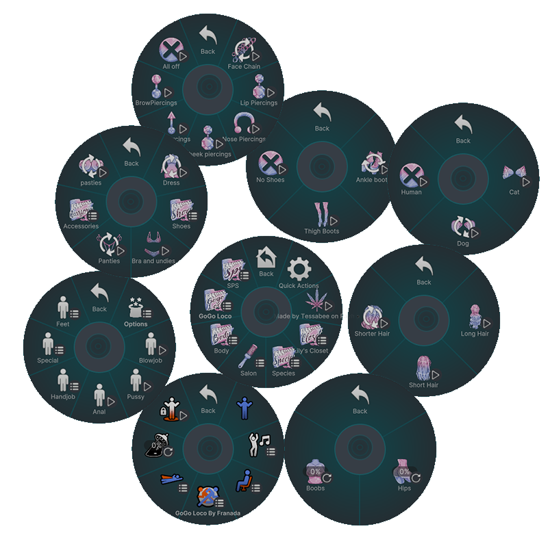 - 3 hair toggles, Two shoe Toggles, One Outfit Toggle, 3 Species Toggles, Face piercing toggles, Face chain toggle