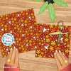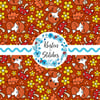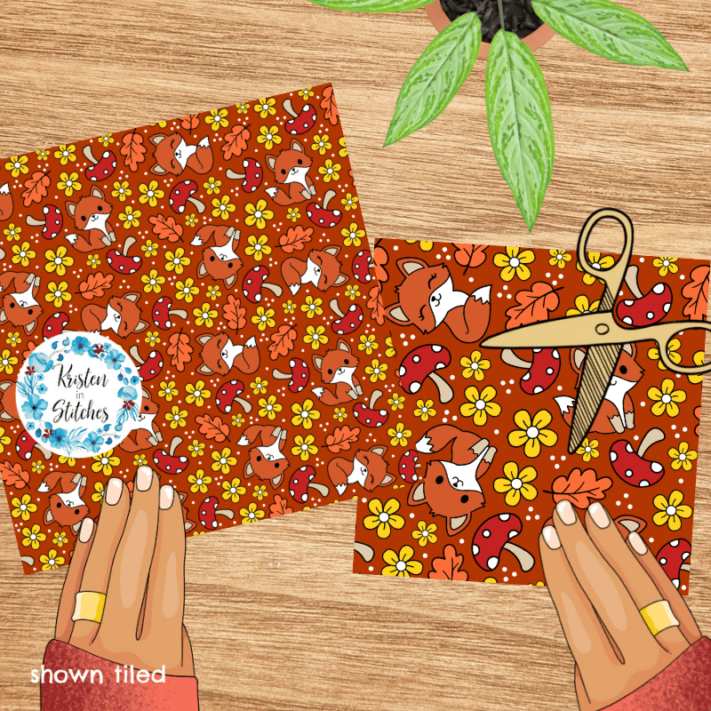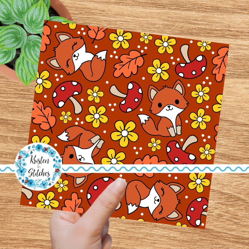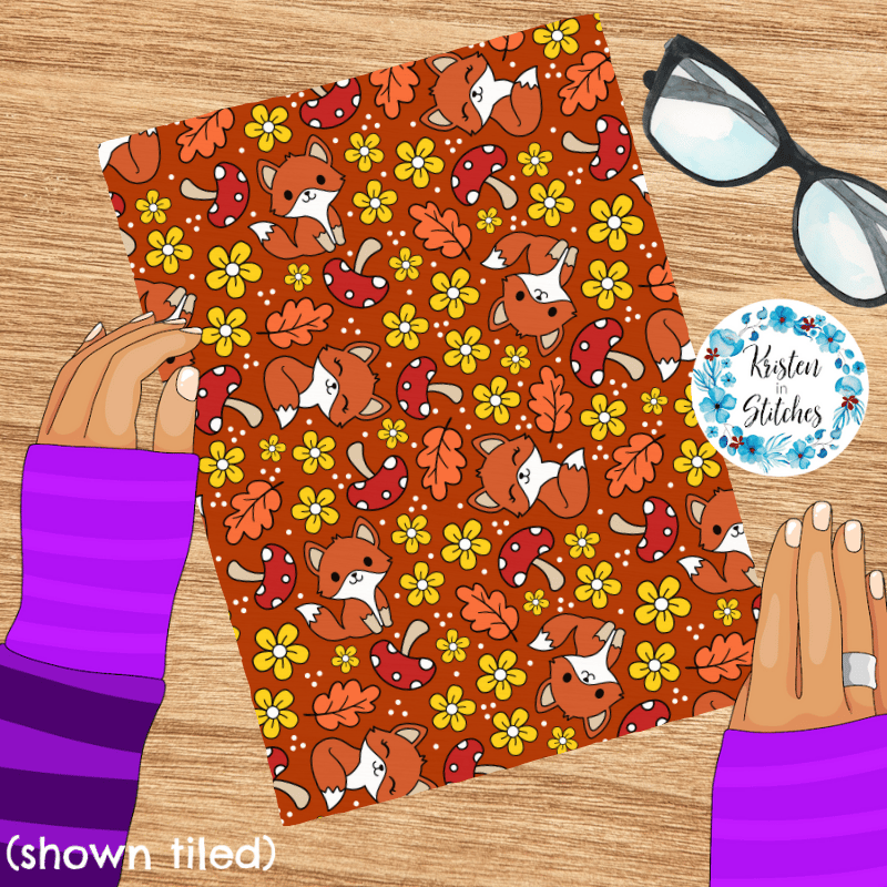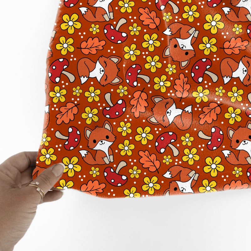 Sweet little fox friends with flowers and mushrooms on rust brown.