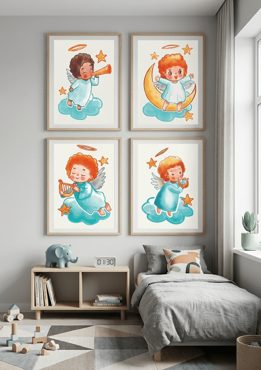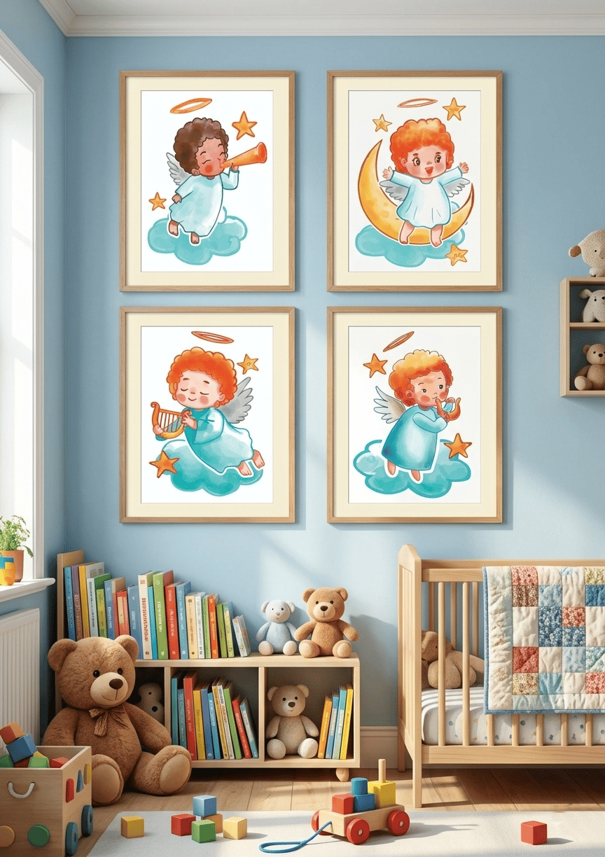 Set of 4 Cute Baby Angel Illustrations - Nursery Wall Art - Soft Watercolor Style - Celestial Children's Room Posters