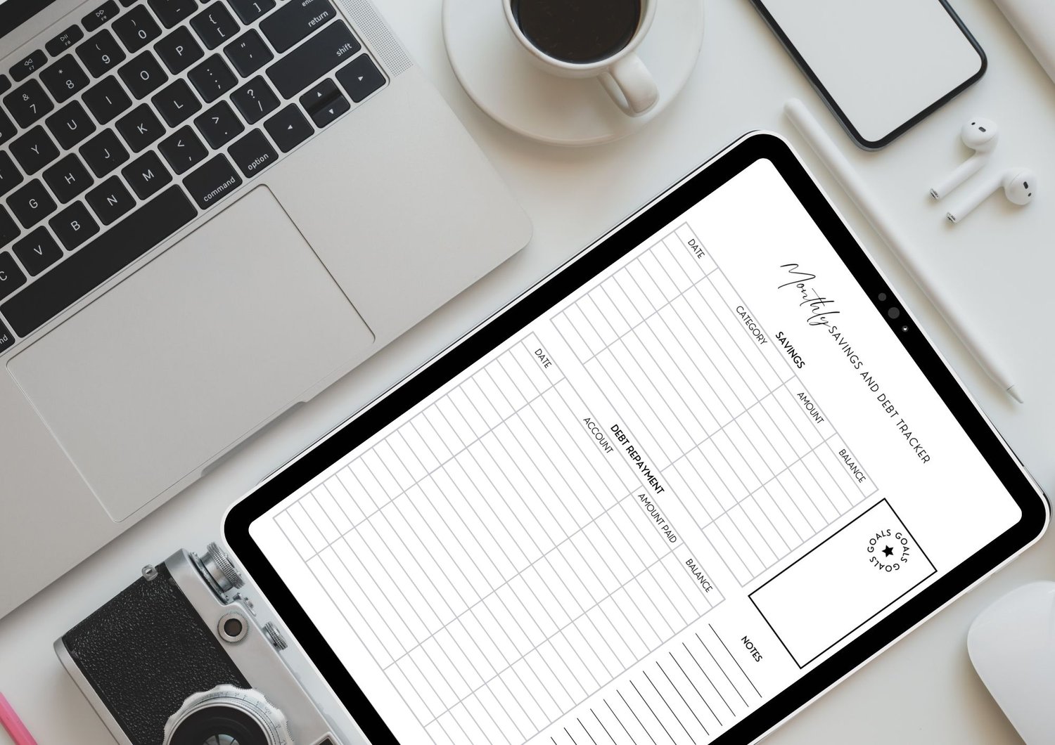 - Monthly Savings and Debt Tracker with space to record the month's financial goals and notes.