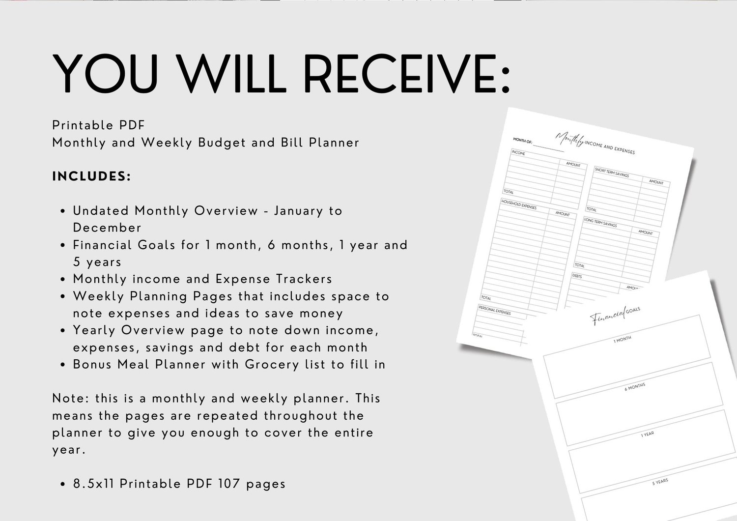 Detailed Monthly and Weekly Budget and Bill Planner 8.5x11 100 Pages Printable PDF.