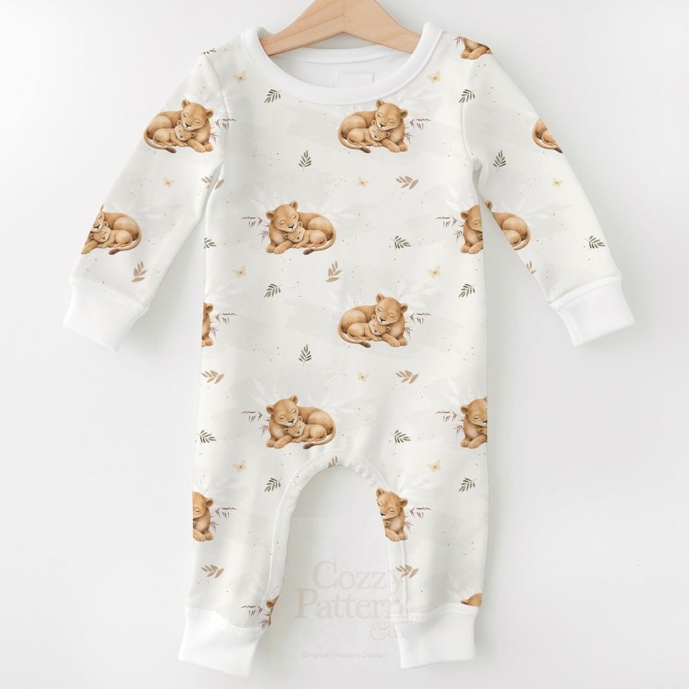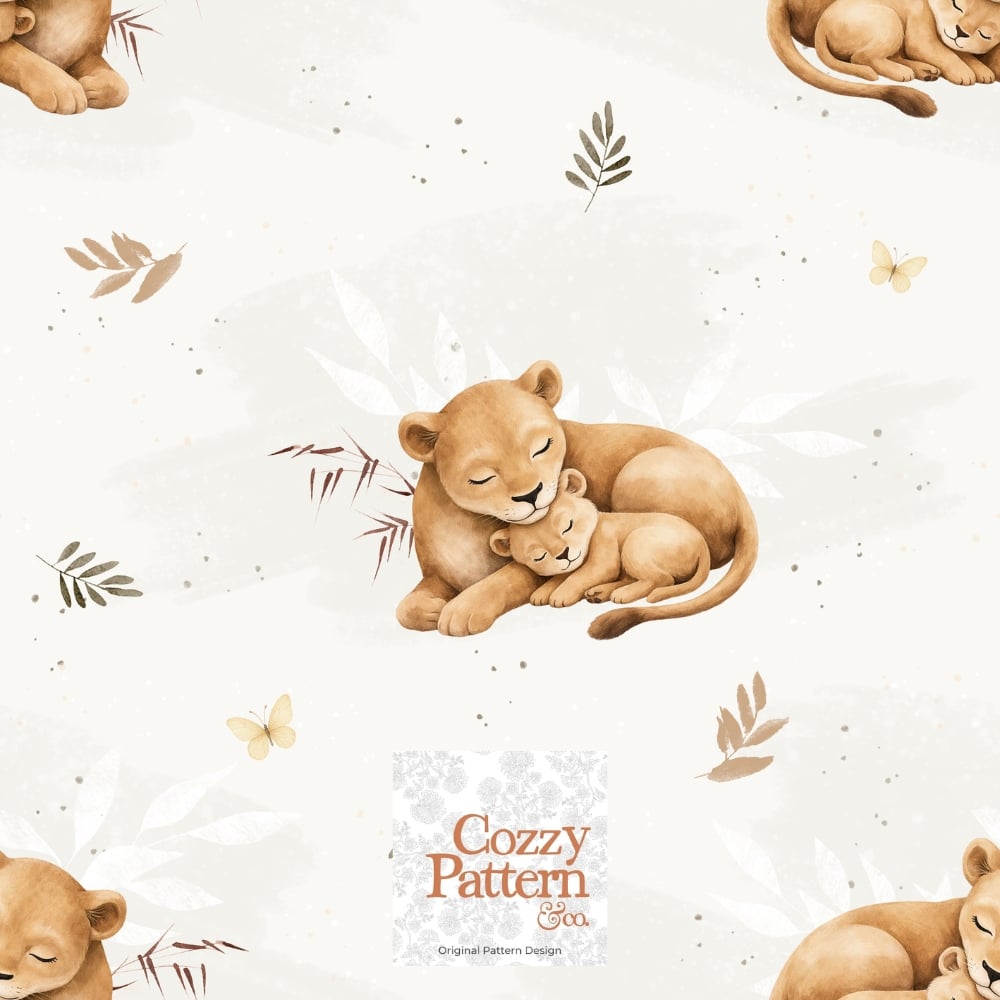 Create adorable baby and nursery projects with this sleeping lion cub seamless pattern, a soft safari-inspired design featuring a mother lion cuddling her baby surrounded by delicate leaves, butterflies and subtle botanical elements.