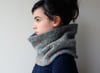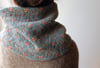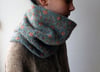 Le col est tricoté en rond, tel un long tube puis plié en deux afin de créer un col double face, chaud et qui tient joliment autour du cou. Après un montage provisoire des mailles, le jacquard doux et subtil est travaillé, il s’agit de la face extérieure. Puis, dans la continuité, la face intérieure est tricotée. Elle est composée de rayures et a une circonférence légèrement plus étroite afin de permettre au col d’entourer correctement le cou sans s’affaisser. De plus cette construction donne de jolies finitions, puisque les fils tendus du jacquard ne sont pas visibles, “cachés” à l’intérieur. Une fois le “tube” terminé, il est replié vers l’intérieur et les mailles de montage et celles du dernier rang sont cousues ensemble par un grafting.
