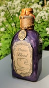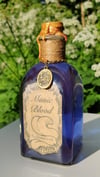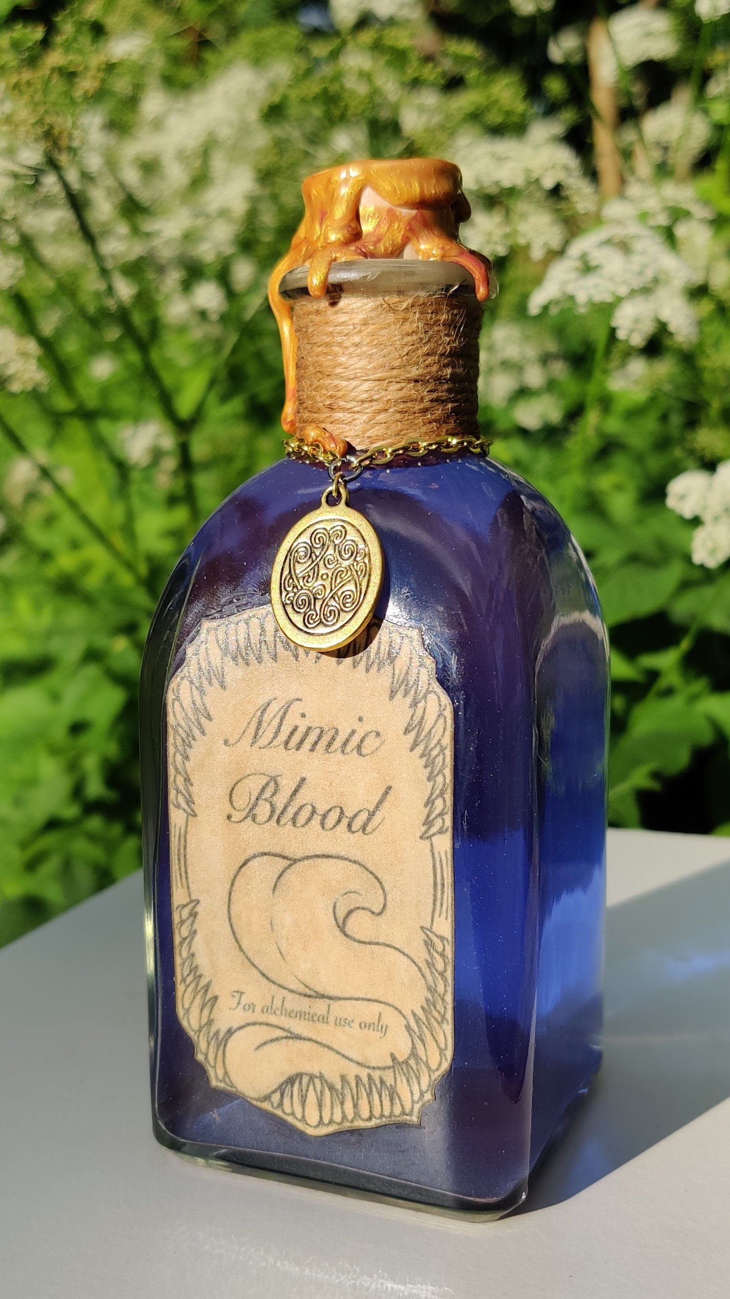Pullossa on sinistä nestettä ja se on koristeltu käsintehdyllä etiketillä, juuttinarulla sekä ketjulla ja riipuksella.
