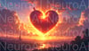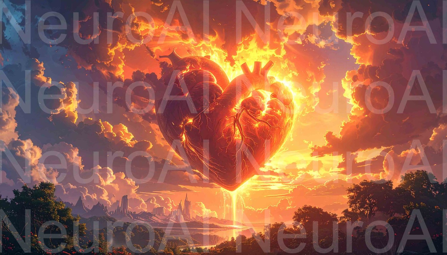 Fiery heart in a celestial landscape, symbolizing love and passion