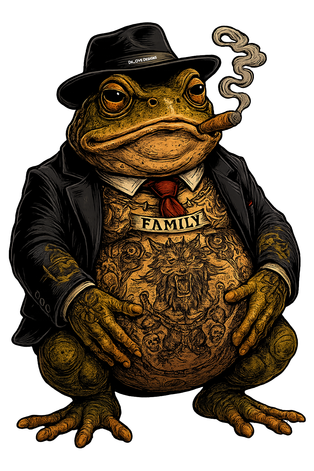 mafia toad, gangster frog, tattooed toad, mob boss art, animal illustration, fantasy toad, frog with cigar, cool frog art, realistic animal design, streetwear art, bold graphic design, funny amphibian, mafia animal, gangster animal, boss frog, tattoo illustration, fantasy artwork, creative character design, digital art, diiovedesigns, DiiStyle