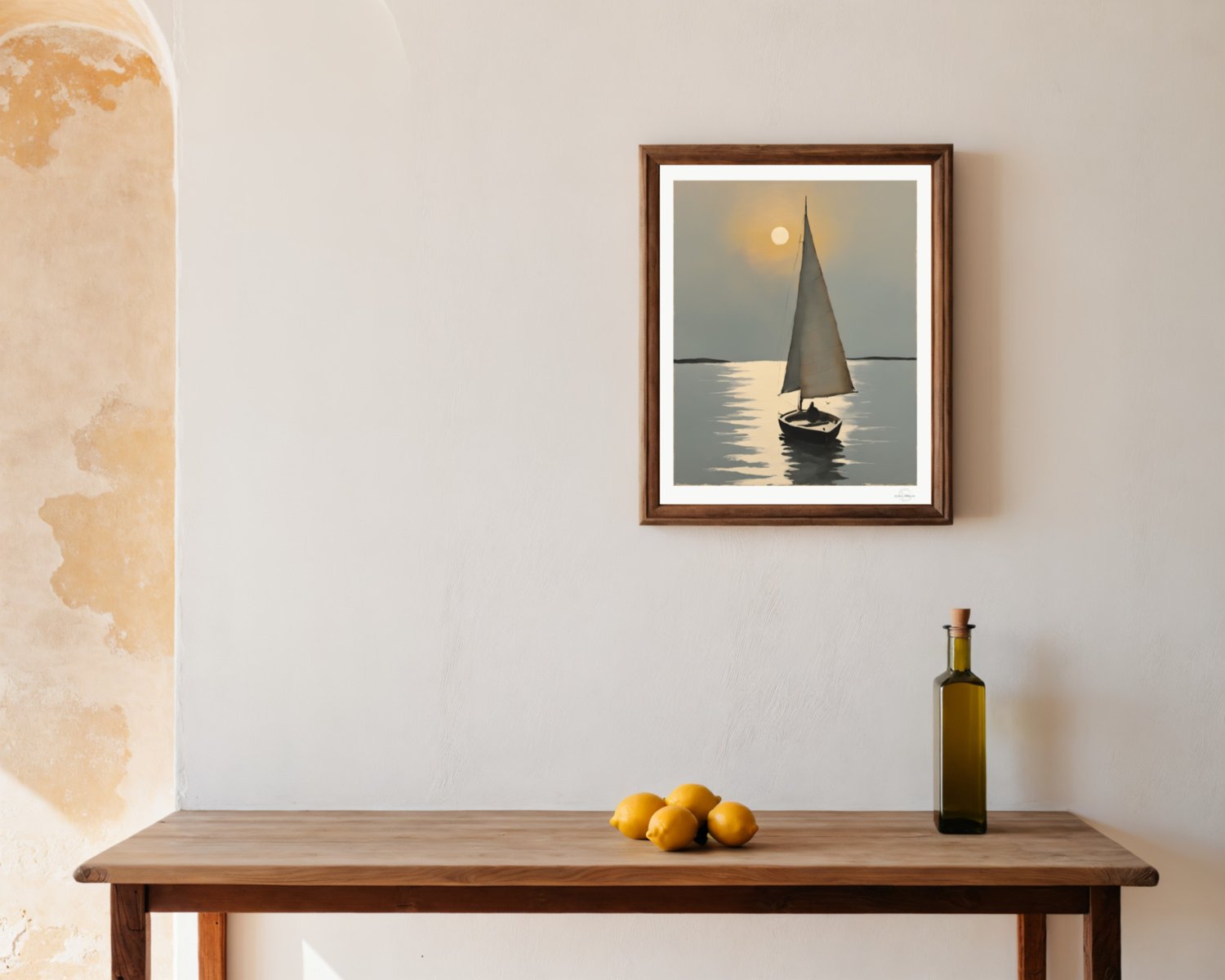 A minimal sailboat drifting across calm Mediterranean waters, bathed in soft, warm light.