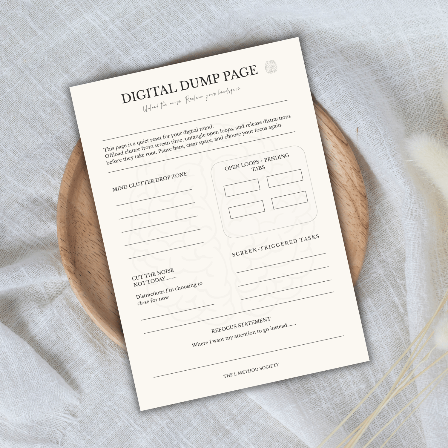 This guided tool gives you a simple space to unload all the digital noise — tasks, thoughts, reminders, and random ideas — so you can organise what matters and release the rest. Perfect for decluttering your head before focusing on what’s next.