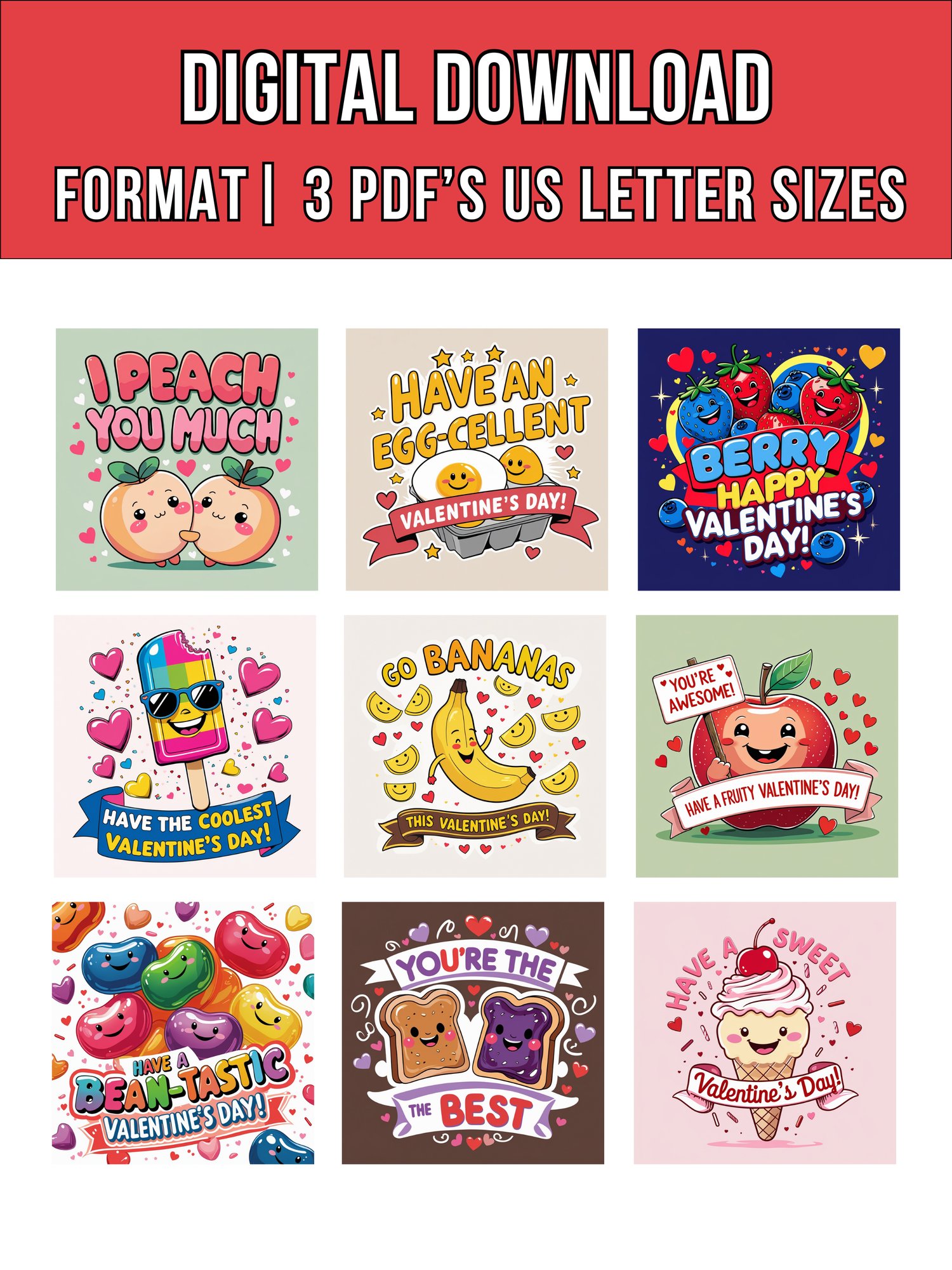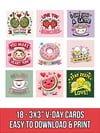 Brighten Valentine’s Day with these adorable and playful Fun Food Valentine Cards! This digital download set includes 18 unique designs, each measuring 3x3". Featuring cute and cheerful illustrations of food with sweet and punny messages, these cards are perfect for kids to share with classmates, friends, and loved ones.