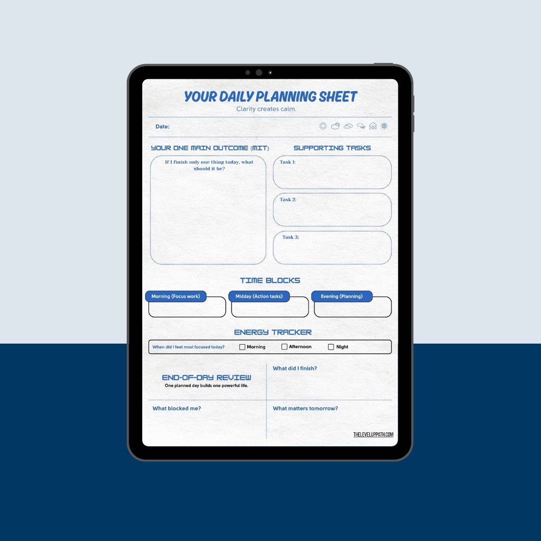 The Level Up Daily Planner is made for anyone who wants a clear, simple, and grounded way to take control of their day without feeling overwhelmed. Whether you’re building better habits, juggling work and personal goals, or trying to stay consistent with your routines, this planner gives you a daily system that actually fits real life.