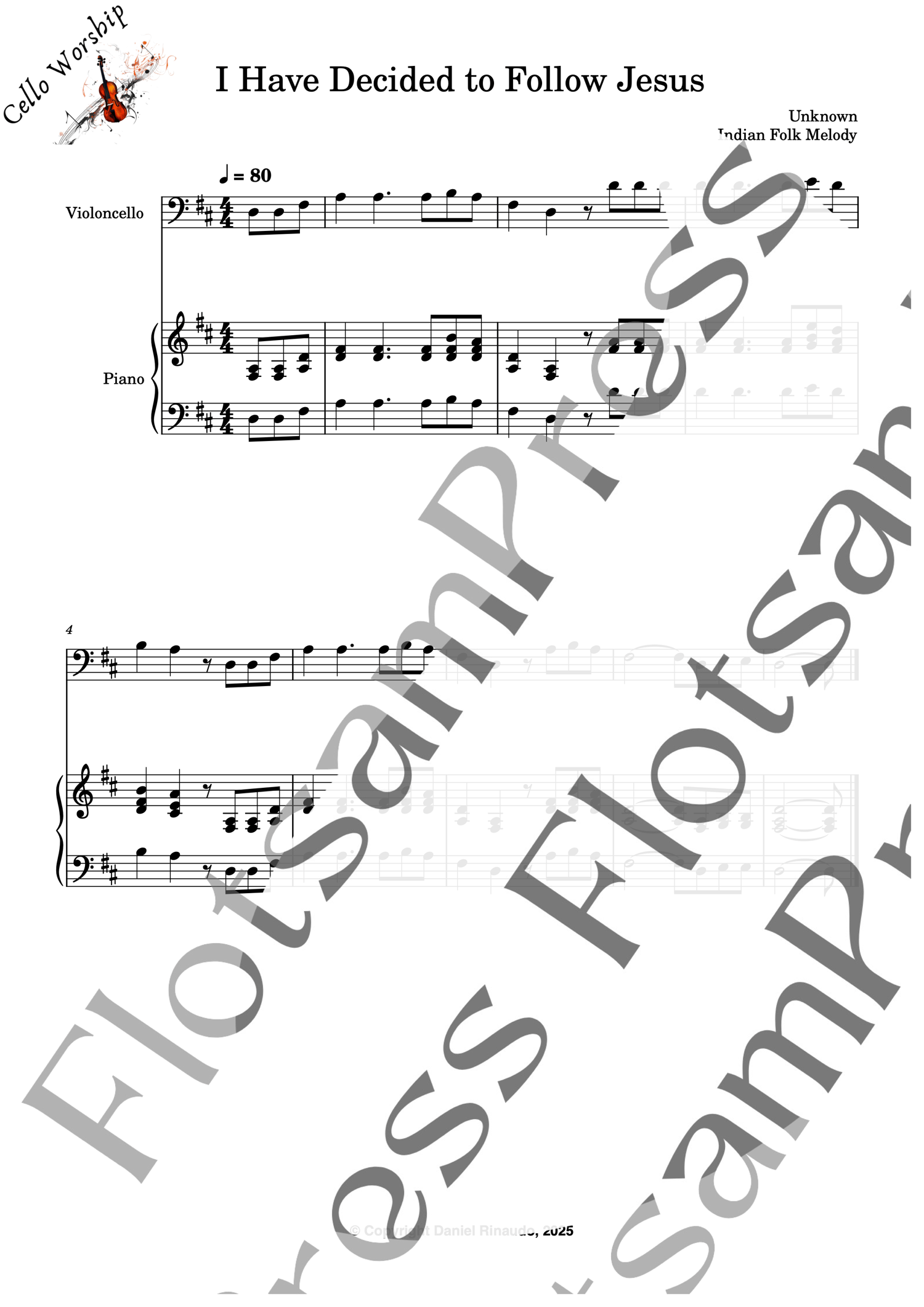 This arrangement of I Have Decided to Follow Jesus is written for beginner to lower-intermediate cello players, with a simple and supportive piano accompaniment. Perfect for church services, lessons, or home practice.
