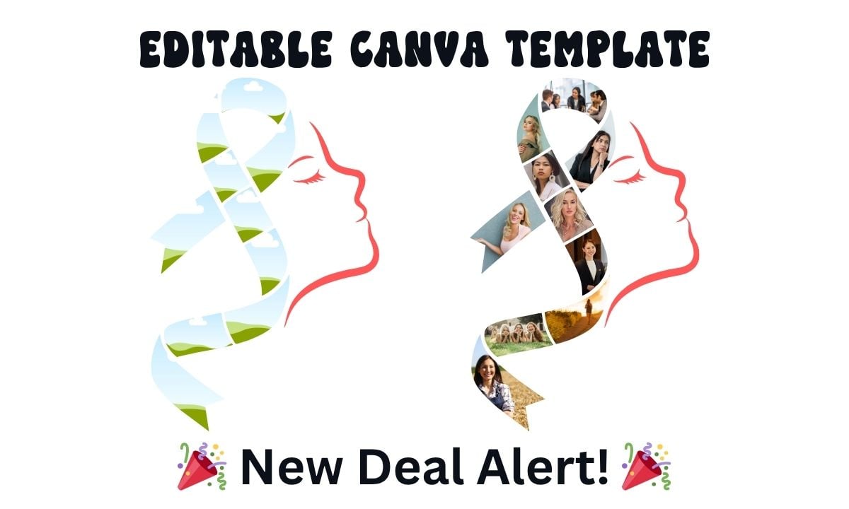 This elegant and modern Canva Frame Template is designed for businesses, coaches, and advocates focused on women's empowerment and professional branding. The graphic features the graceful side profile of a woman's face integrated with an awareness ribbon that is divided into a drag-and-drop photo collage. This template is ideal for creating visually stunning content for business announcements, social media marketing, digital product covers, and celebrating female leadership and diversity. Quickly make your visuals stand out with this unique, professional layout.