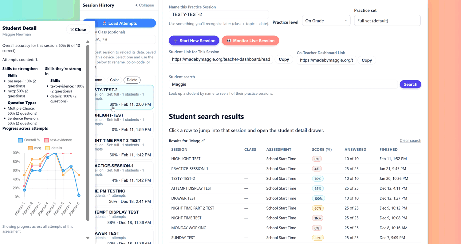 The student trainer runs in the browser, and the teacher dashboard is designed for classroom reporting and progress monitoring. Student responses are connected to the practice session a teacher creates so results and session history can be viewed in the dashboard.