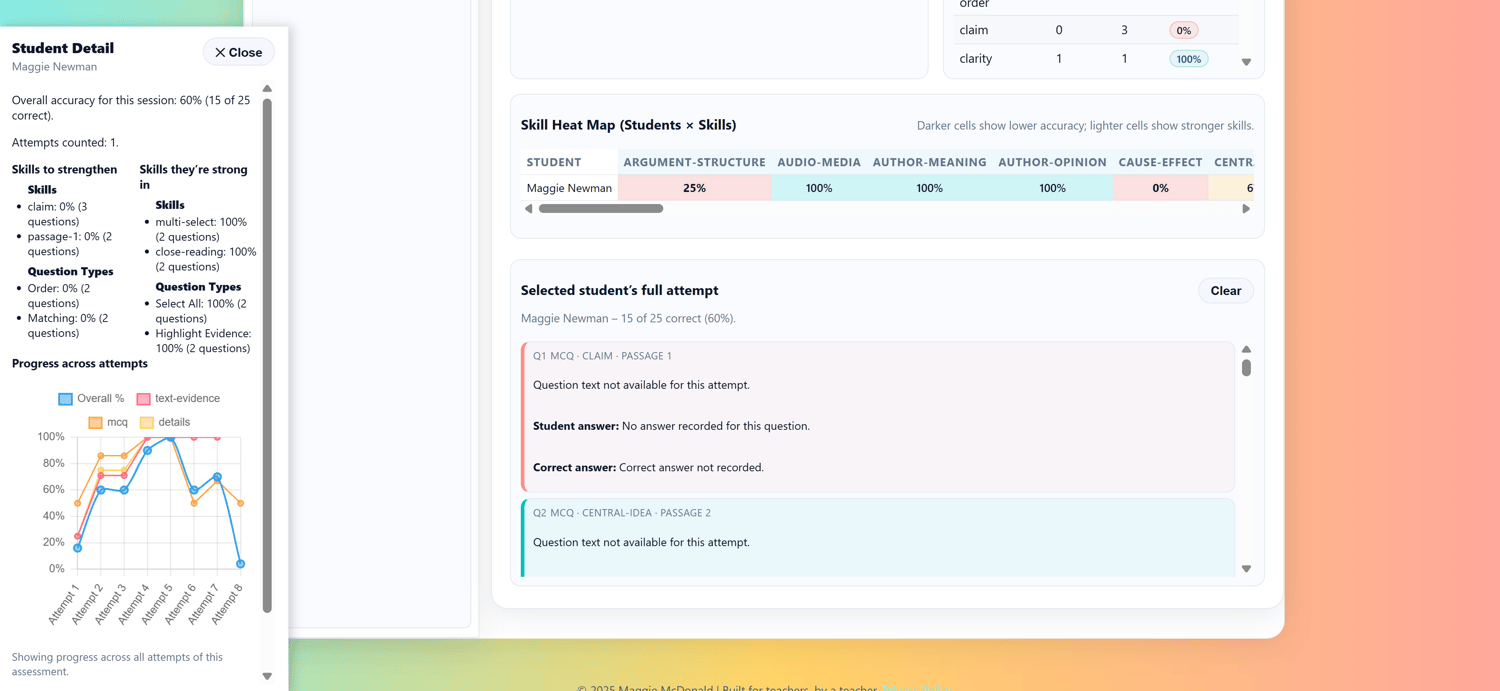 Students work through passages + questions using built-in tools like highlighting and answer cross-outs, while the teacher dashboard tracks live progress, question-by-question performance, and skill gaps across sessions.