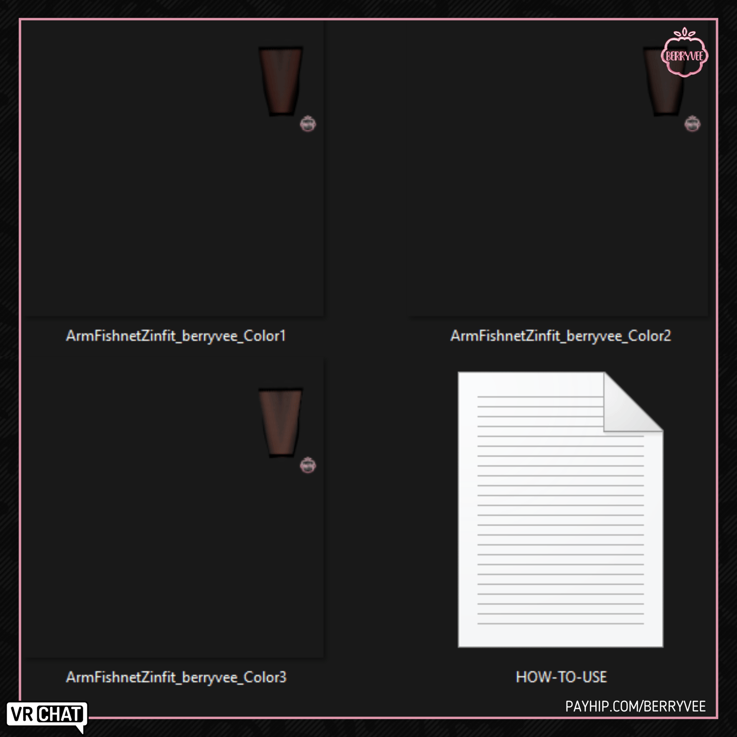 - ✅ All Assets and Avatars sold by berryvee must be properly credited and require hyperlinking to either my Gumroad, Payhip or Discord. [e.g. " Via Hair by berryvee " or " Via Hair by berryvee " ]