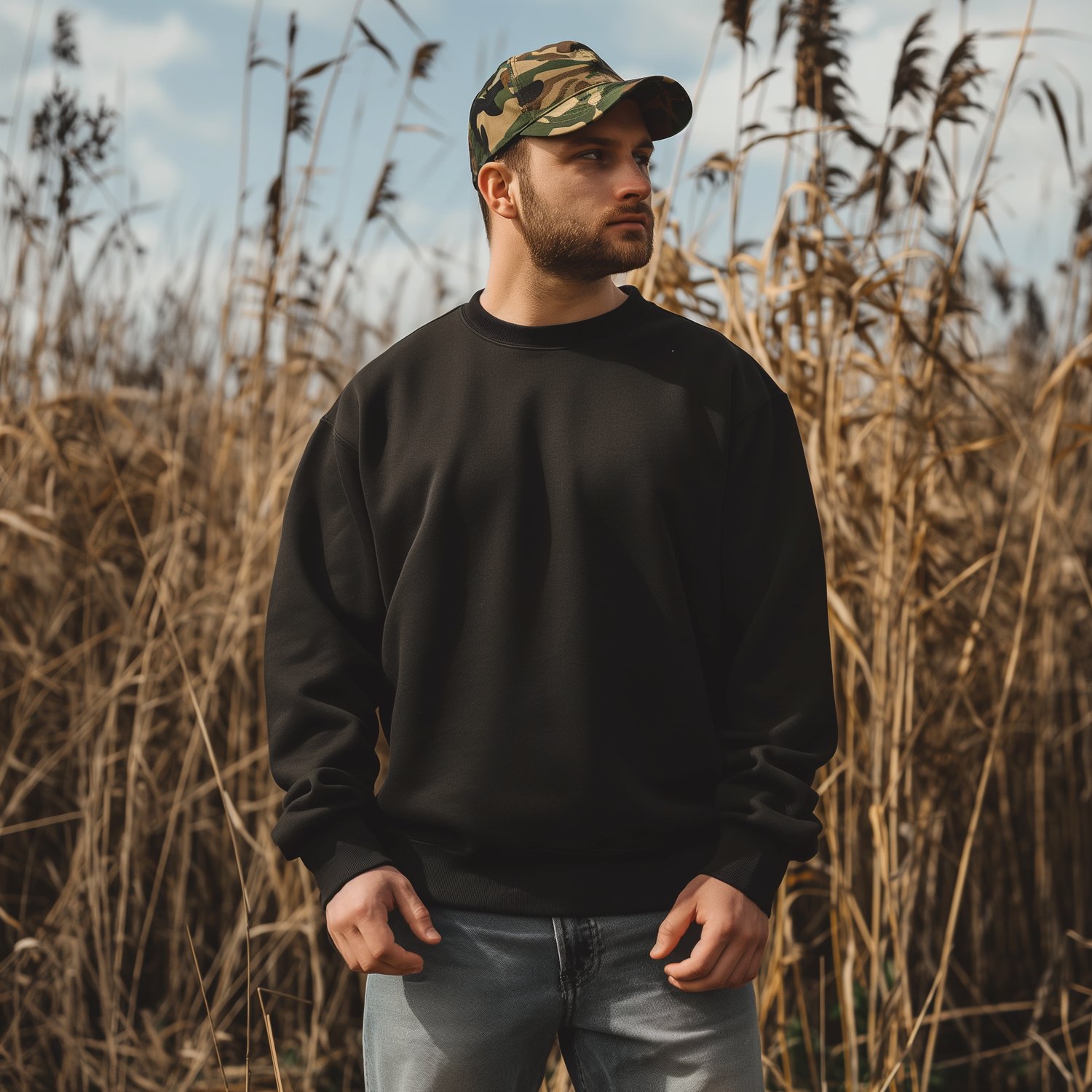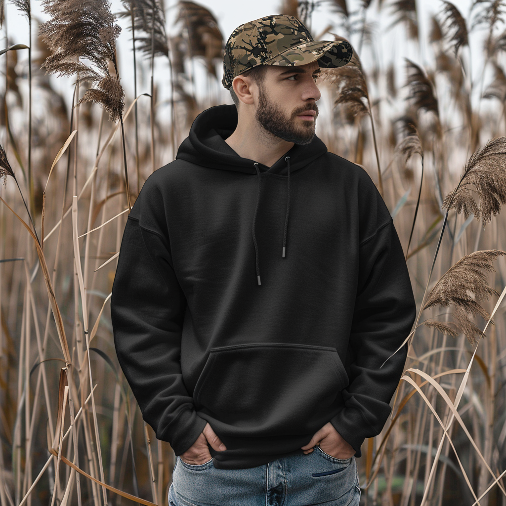 You’ll get 4 high-quality mockups featuring men in black hoodies and camo caps, styled in natural fields and woods. Each mockup gives a different angle and look so you can easily display your hunting or outdoor-themed designs.