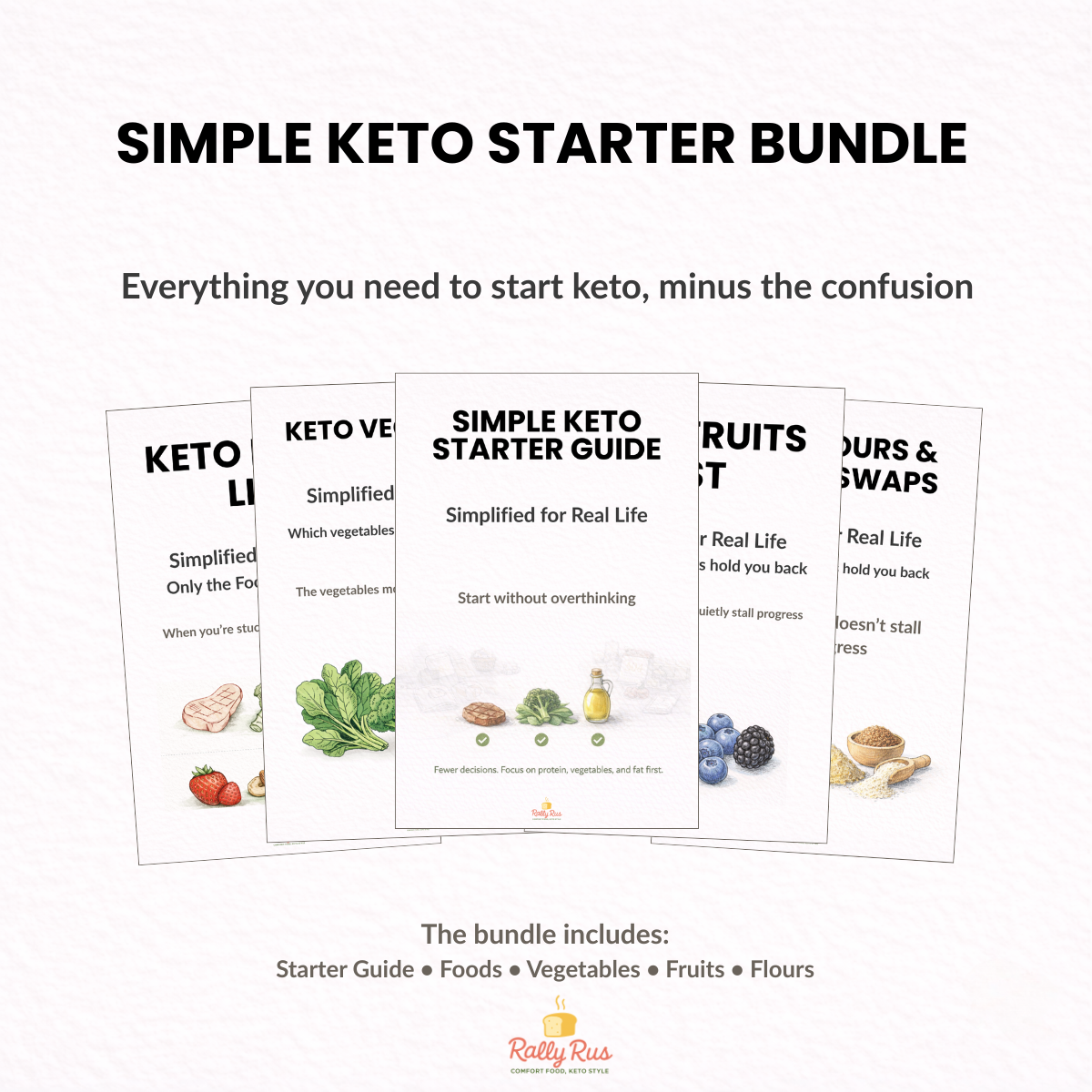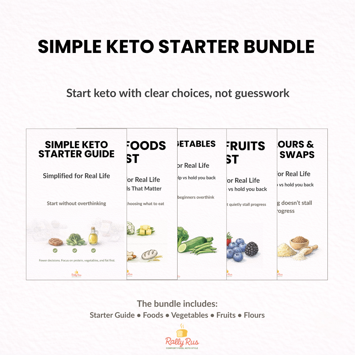 The Keto Starter Bundle includes five beginner-friendly guides focused on food clarity: