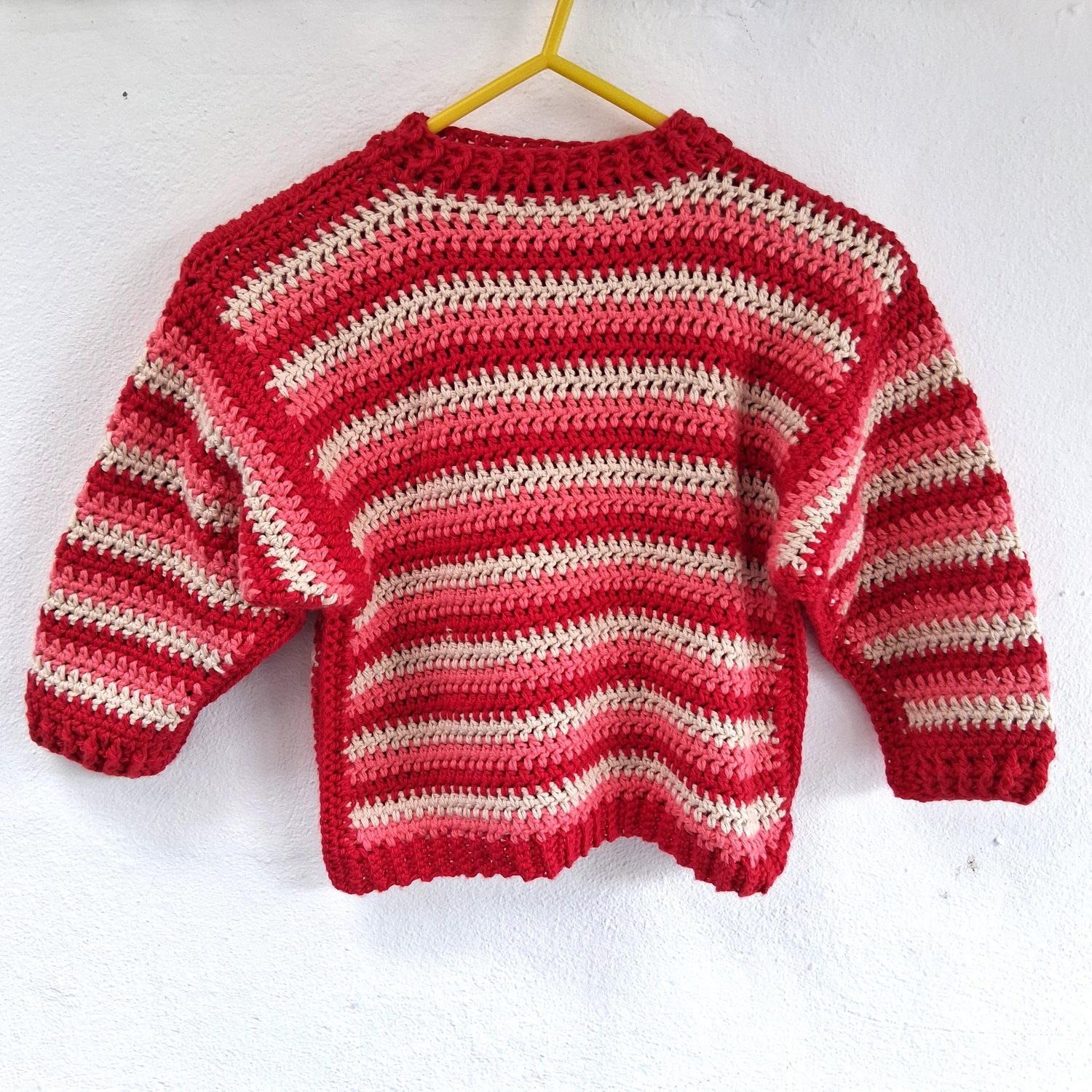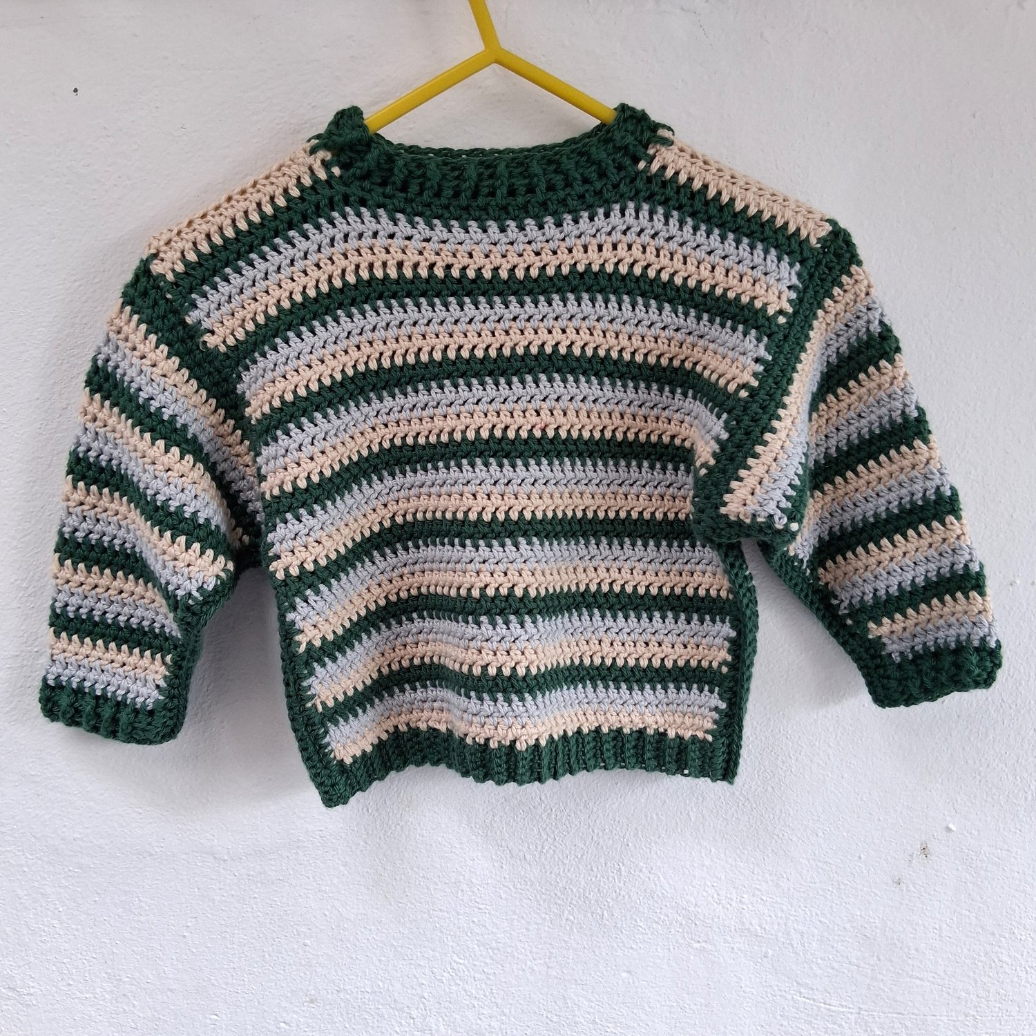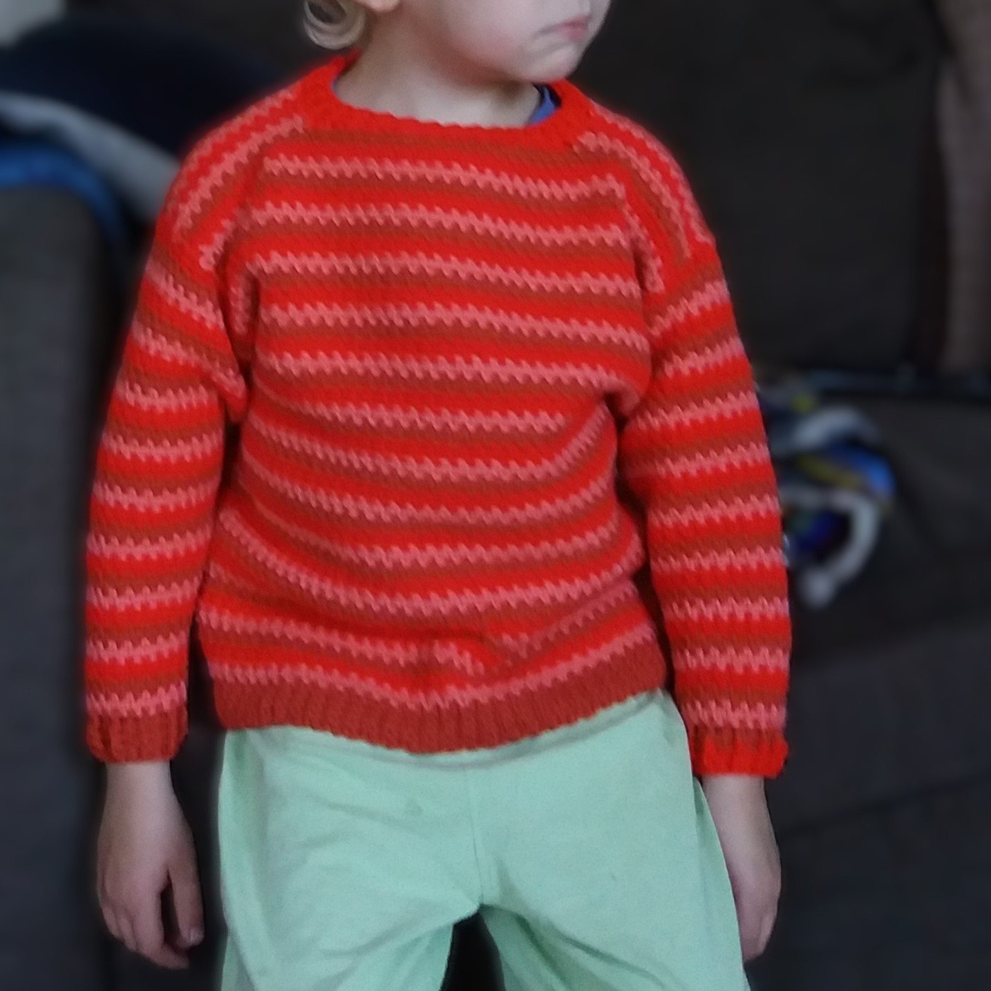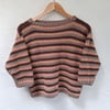 A simple boxy sweater for children. The front and back pieces are identical, designed so that it can be worn either way around – makes getting dressed simpler for little ones. Plenty of room in the arms, and cosy ribbing around the cuffs and neck.
