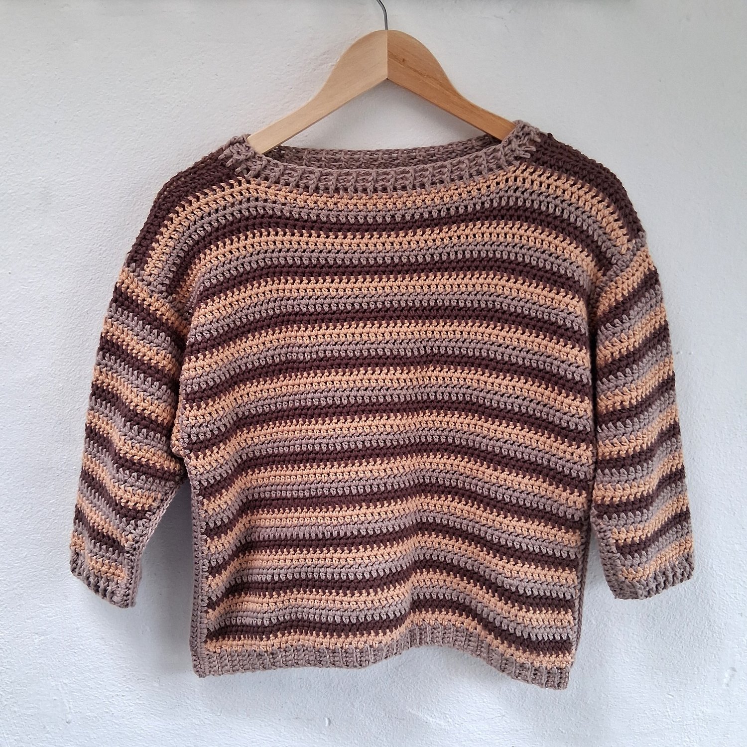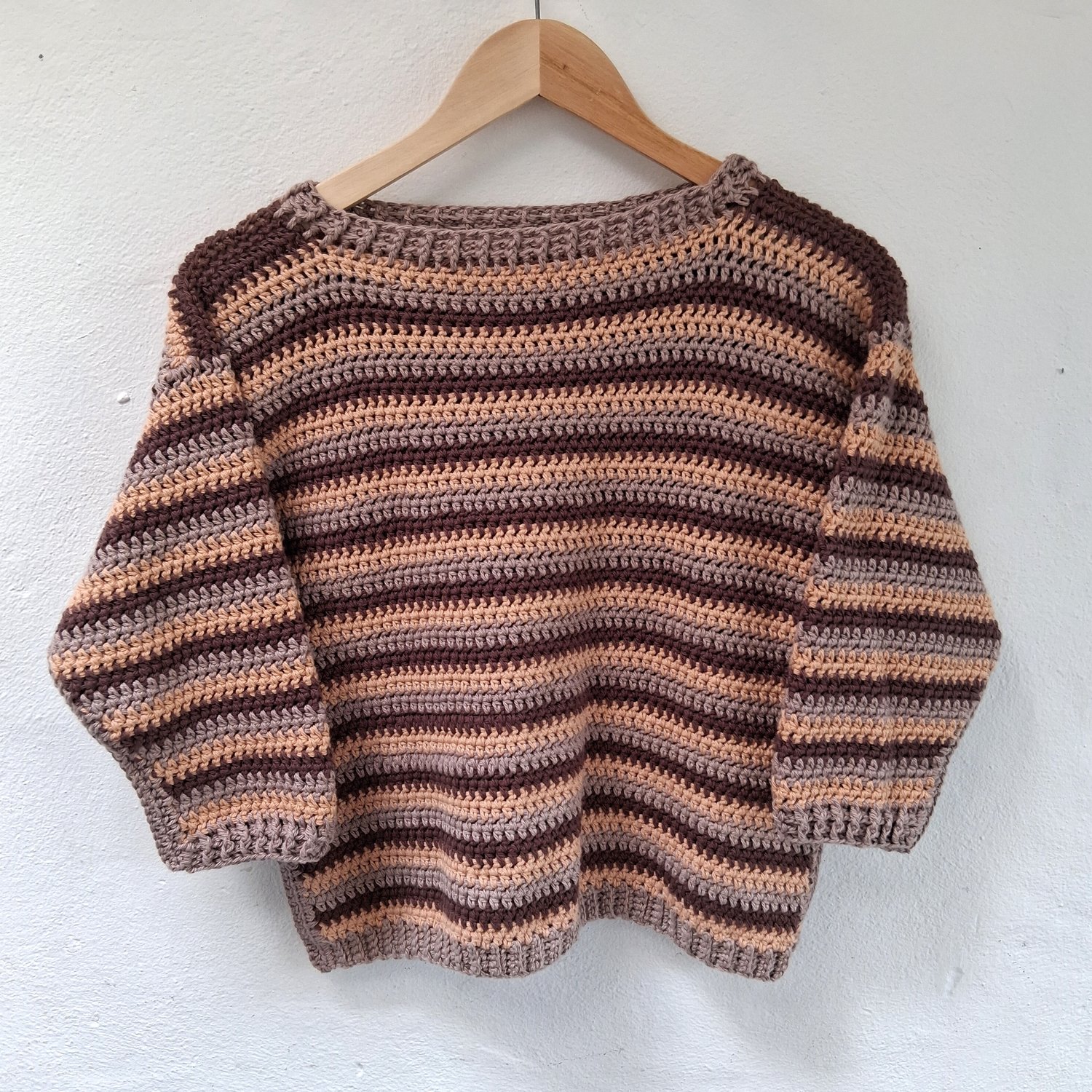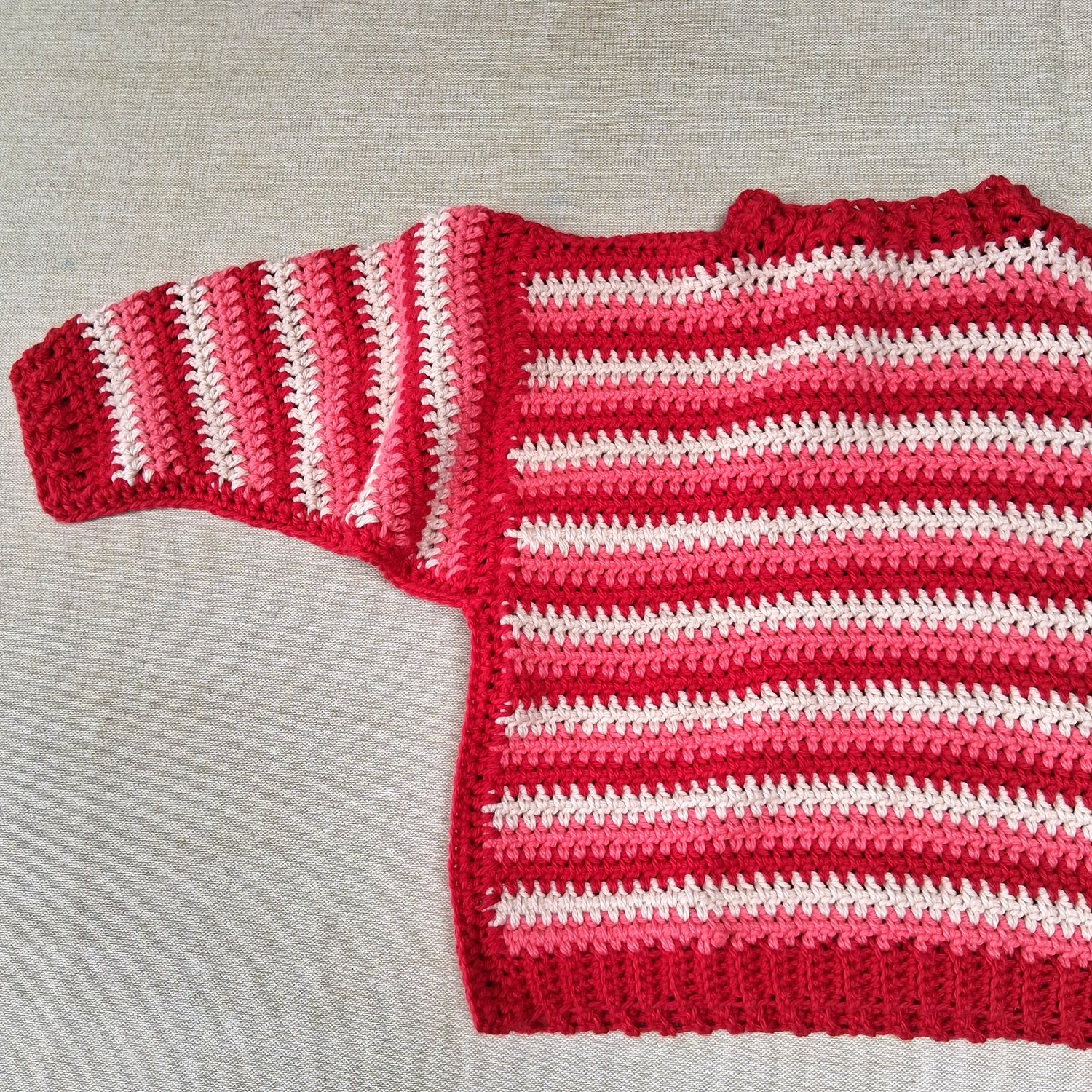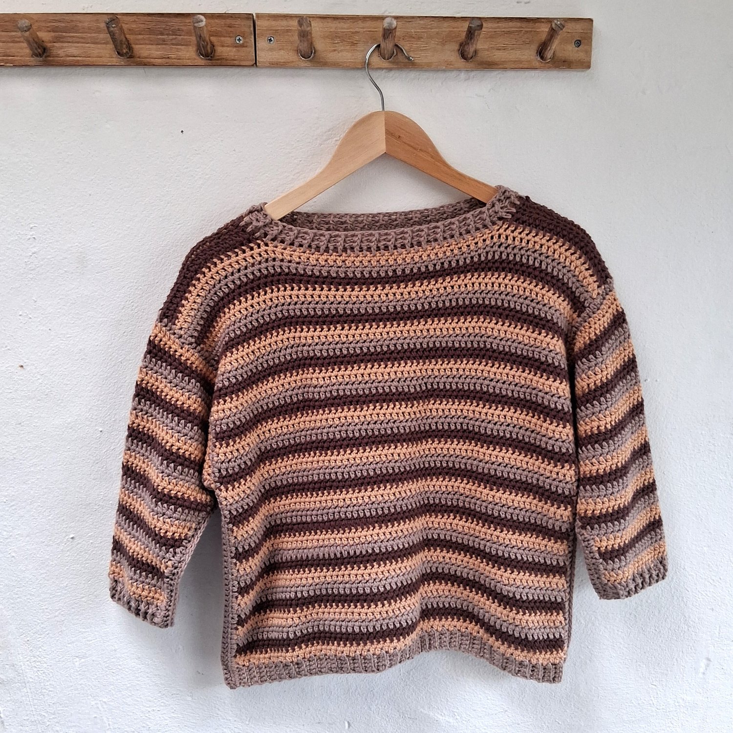 A simple boxy sweater for children. The front and back pieces are identical, designed so that it can be worn either way around – makes getting dressed simpler for little ones. Plenty of room in the arms, and cosy ribbing around the cuffs and neck.