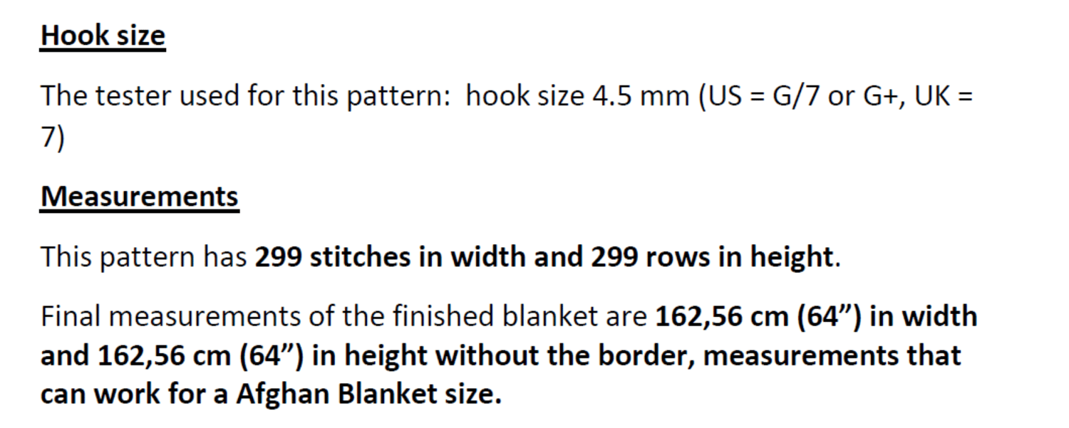 For this pattern, my tester Srislg Lanka used a 4.5 mm hook (US = G/7 or G+, UK = 7) and the measurements with the recommended yarn were 162,56 cm (64”) in width and 162,56 cm (64”) in height without the border, measurements that can work for an Afghan Blanket size or to decorate a wall.