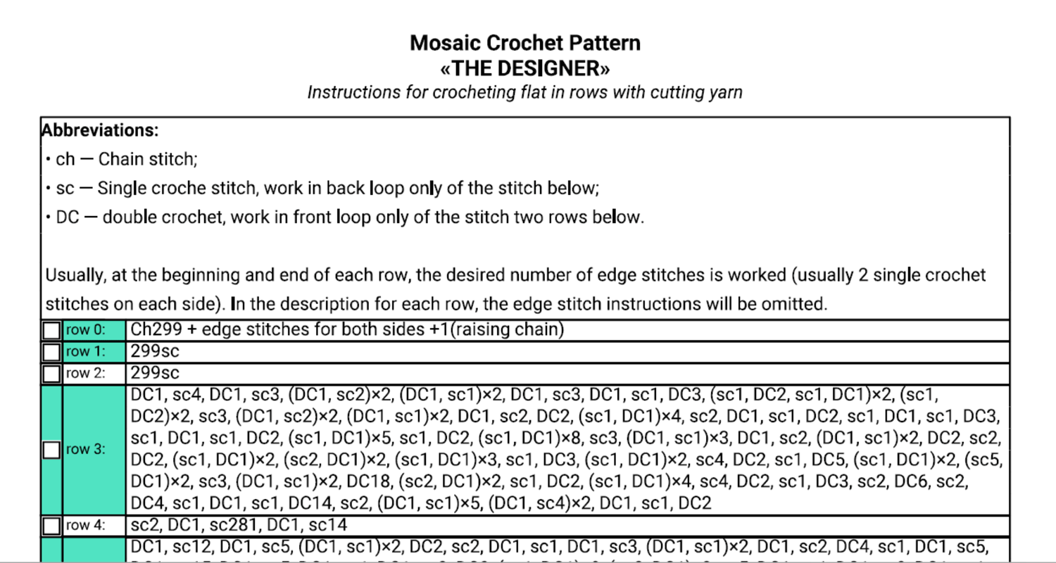 - Written pattern, row by row in PDF