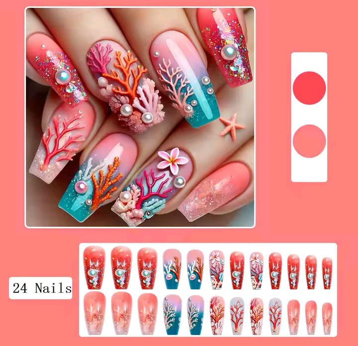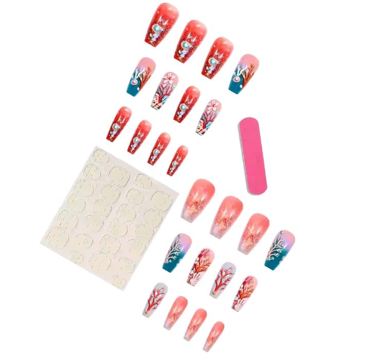 24 pieces of ocean underwater nail design. Safe and durable material: These press-on artificial nails are made from high-quality ABS acrylic material. They are environmentally friendly, gentle on your natural nails, and resistant to breaking, ensuring long-lasting wear.