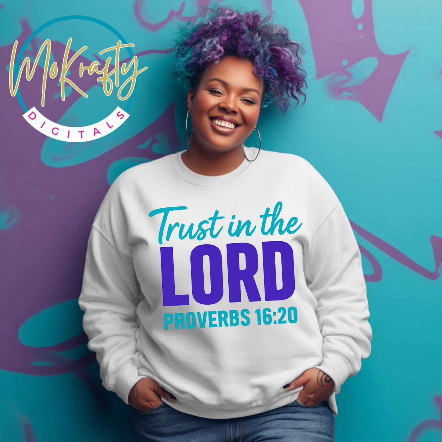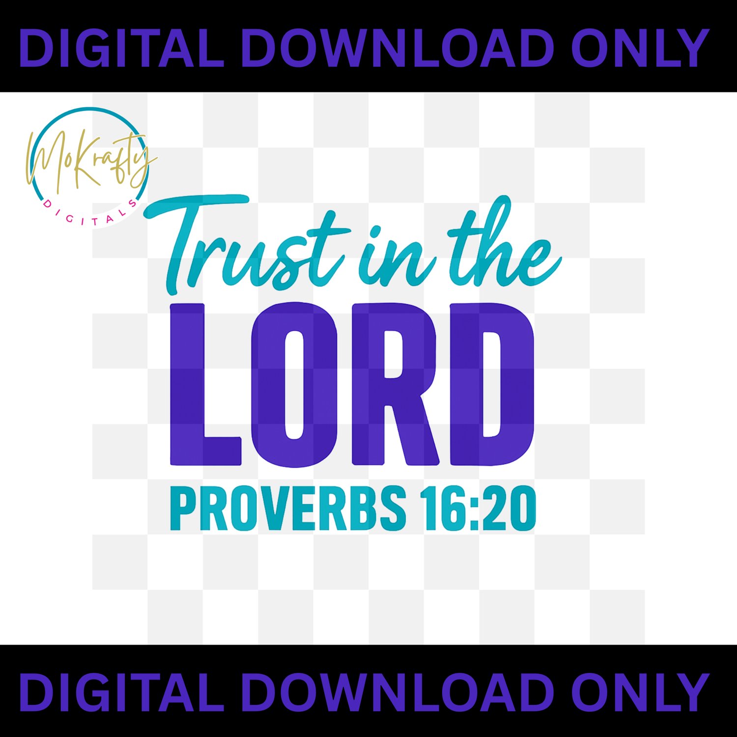 This inspiring “Trust in the LORD – Proverbs 16:20” PNG is designed in a vibrant purple and turquoise palette, perfect for Christian shirts, tumblers, mugs, journals, and digital projects. Great for church merch creators and faith-based businesses.