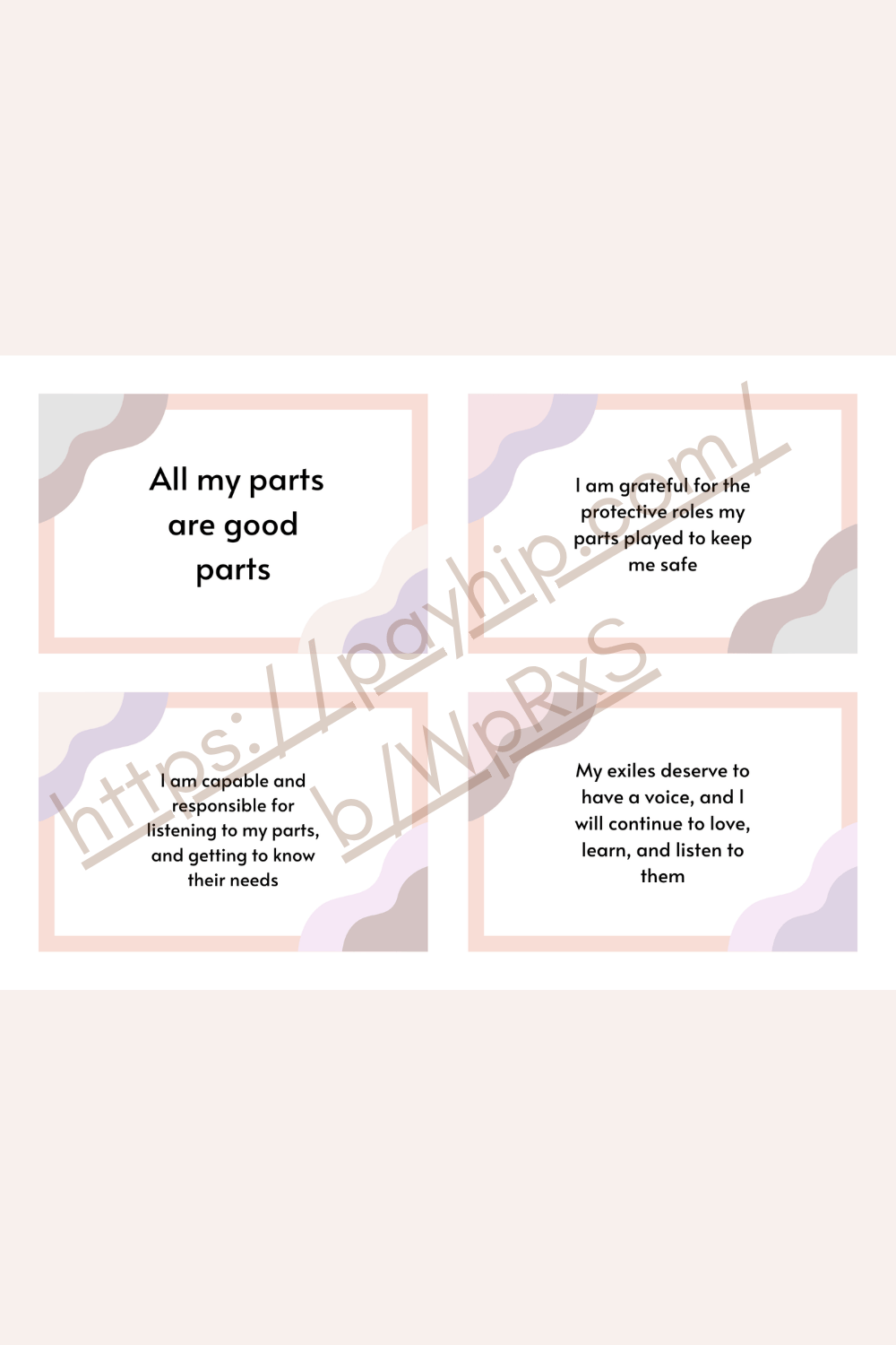 10+ affirmations to practice using on your IFS journey. You can cut out these cards, or just go sheet by sheet as you affirm the value and intent of your parts, as well as introduce more Self-energy into your day using this helpful affirmation deck!