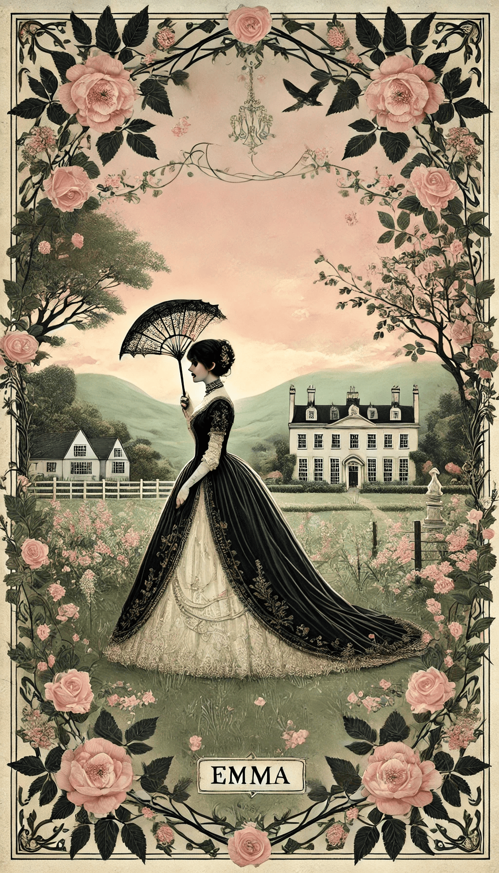 Step into the charming countryside world of Emma with this elegant, text-free digital art print. Inspired by the spirit of Jane Austen’s most playful heroine, this piece blends Regency elegance with a gothic-floral aesthetic, perfect for book lovers and vintage art collectors.