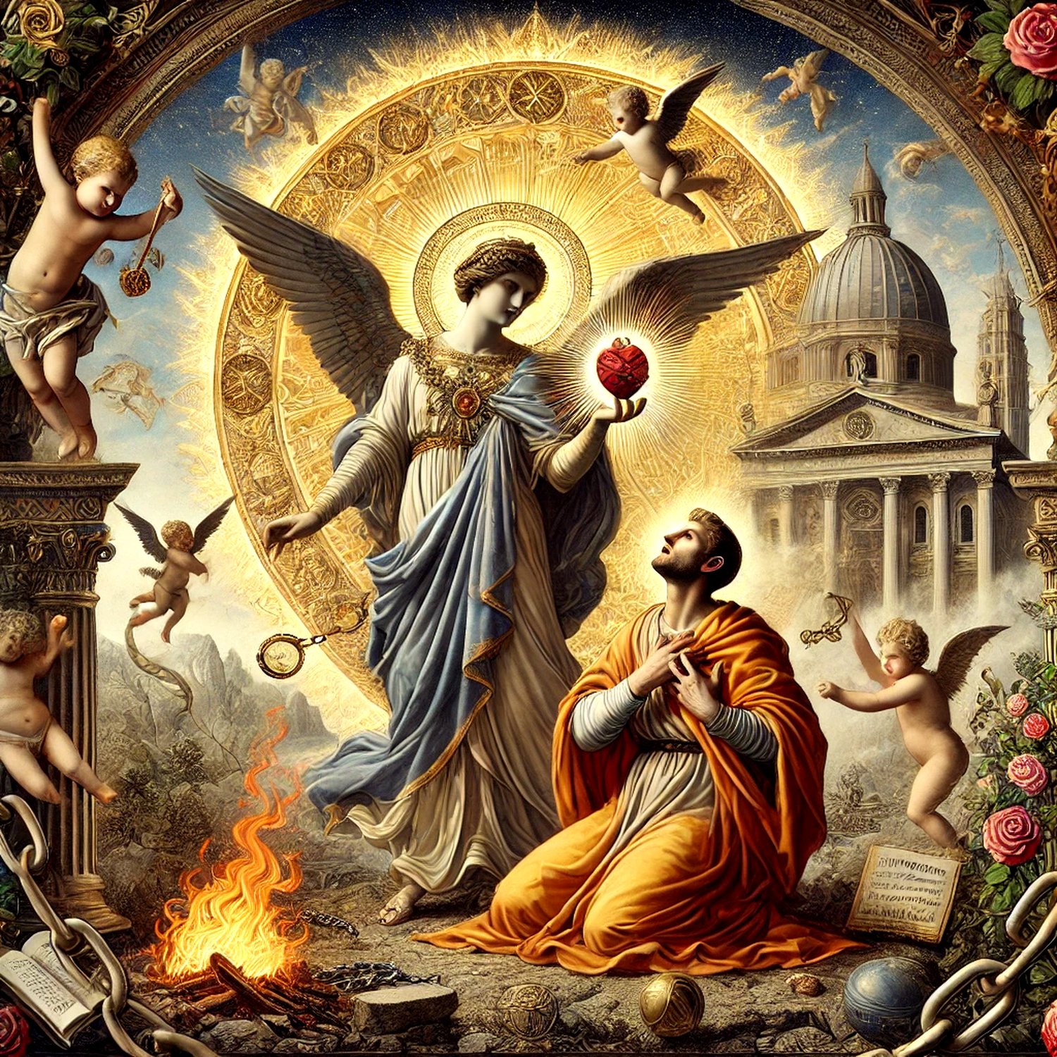 A high-quality Renaissance-inspired digital print, rich in historical and poetic symbolism. Created in the style of classical Italian paintings, this artwork blends allegory and spirituality, making it ideal for those who appreciate the fine details of historic art and literature.