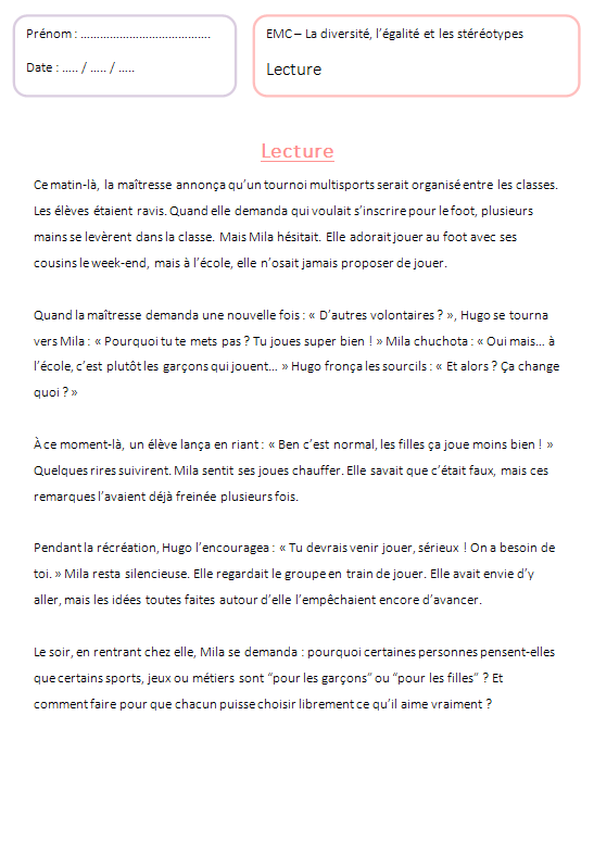 Ressource pédagogique CM1 – CM2 – 6e | EMC / EVAR – Diversité, égalité, lutte contre les stéréotypes