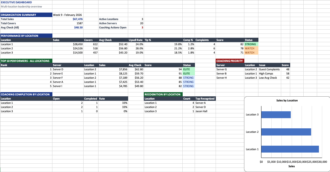 Instructions: complete setup and daily workflow guide Setup: configure your concept, scoring weights, and performance standards Locations: multi-location setup with manager and contact information Employees: full server roster with position, hire date, and status Shift Entry: log every server's shift data including sales, covers, tips, and comps Daily Server Performance: automated performance scoring by shift Weekly Ranking: ranked server leaderboard with selectable week and location filter Coaching Tracker: log every coaching conversation with follow-up tracking Recognition Tracker: document achievements, shoutouts, and positive reinforcement Sales and Covers Analysis: revenue per cover, average check, and sales trend by server Tip and Comp Analysis: tip percentage tracking and comp usage by server Trend Dashboard: rolling performance trends across your entire team Location Dashboard: side-by-side performance comparison across all locations Executive Dashboard: multi-location leadership summary with organization-wide KPIs Printable Server Report: clean individual server performance report for reviews Printable Weekly Leaderboard: formatted weekly ranking sheet to post in the building Printable Coaching Report: documented coaching record for employee files Data Tables: supporting reference data for formulas across the workbook Lookup Lists: centralized dropdown lists for consistent data entry Gamification: points, badges, streaks, and leaderboard framework to drive team engagement Performance Standards: define your scoring benchmarks by position and service period
