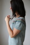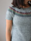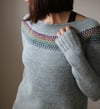 I loved the yarn and stitch pattern of my Cloudbreak shawl so much I decided to turn it into a sweater! It’s seamlessly knit from the top down, with variations for long and short sleeves. A joyous rainbow motif on the circular yoke shines through a cloud-colored background, embracing you in hope, love, and peace.