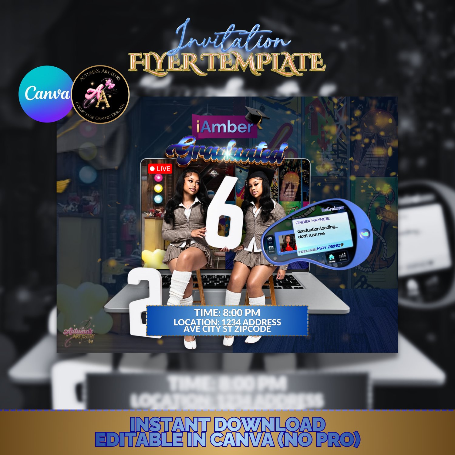 Featuring layered visuals, a “live stream” aesthetic, and interactive-style elements, this flyer turns your graduation announcement into a whole experience.