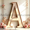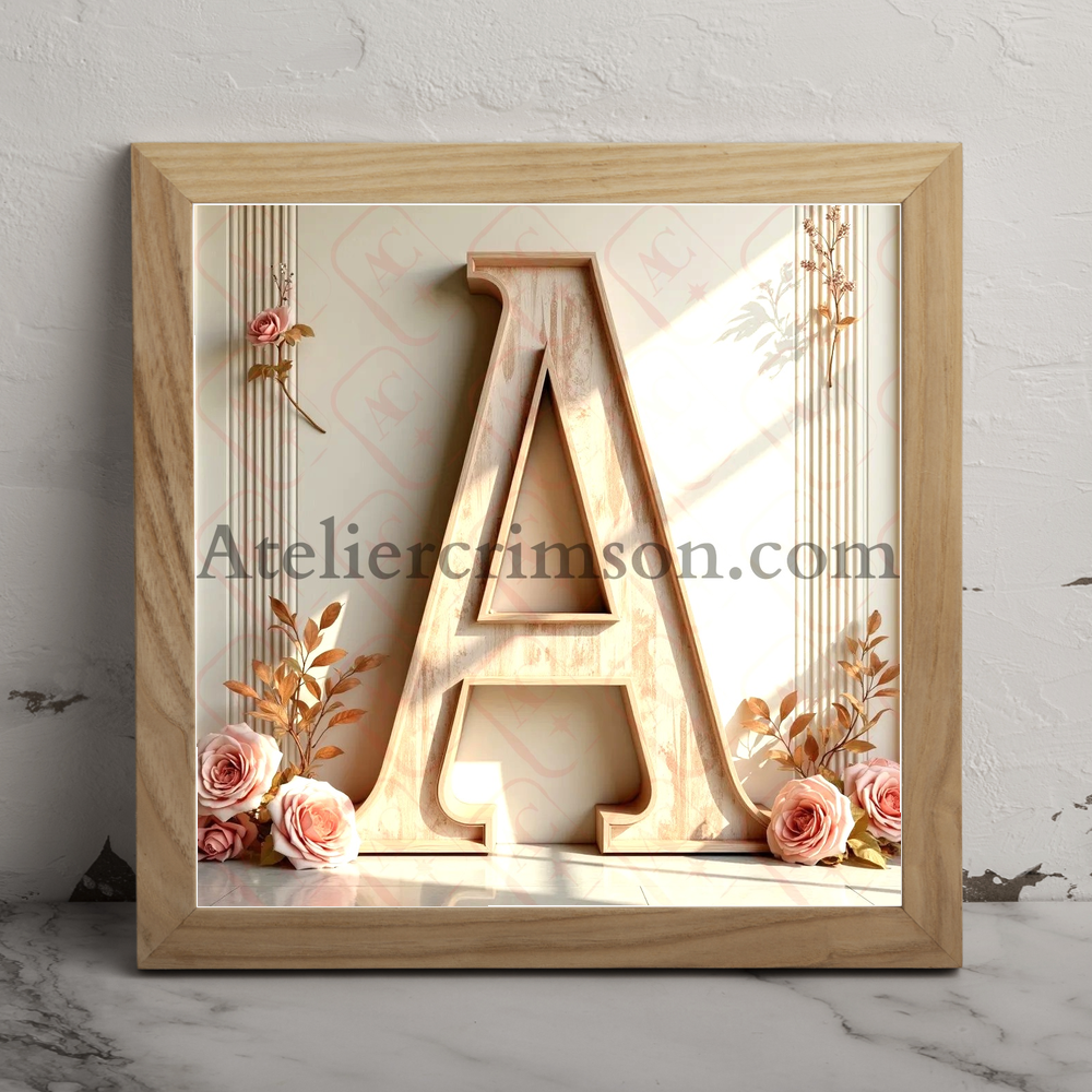 The letter A soft beige wood and flowers Download now this AI-generated image of an elegant, mid-century style character crafted from wood with a soft, neutral background with geometric pattern. Nostalgic and elegantly worn atmosphere.