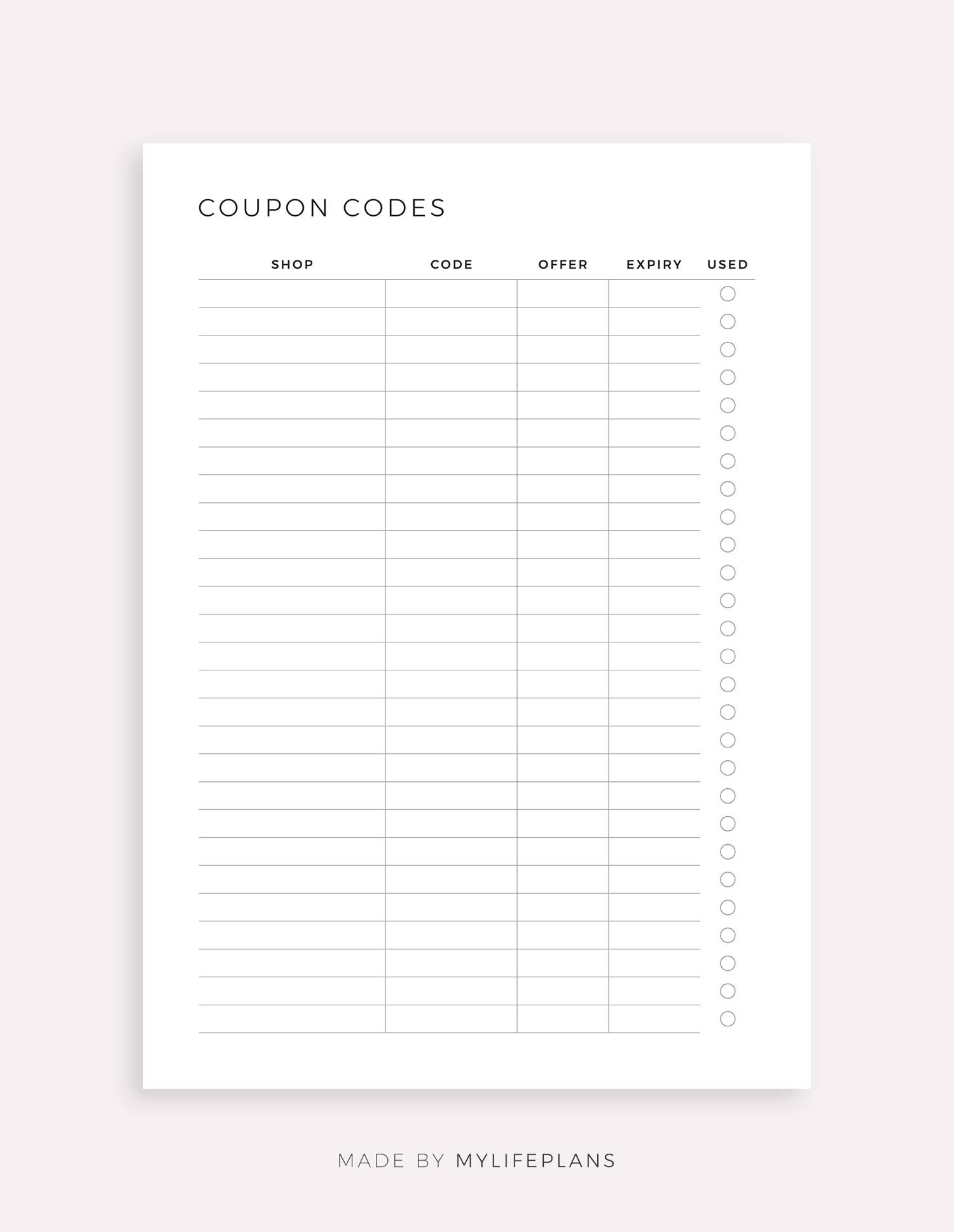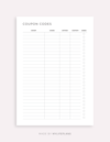 This is a printable coupon codes tracker — just download, print, and start using it right away.