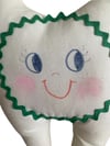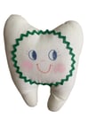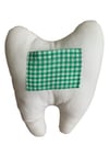 Smiling tooth-shaped pillow. Features green & white plaid back pocket for holding teeth.