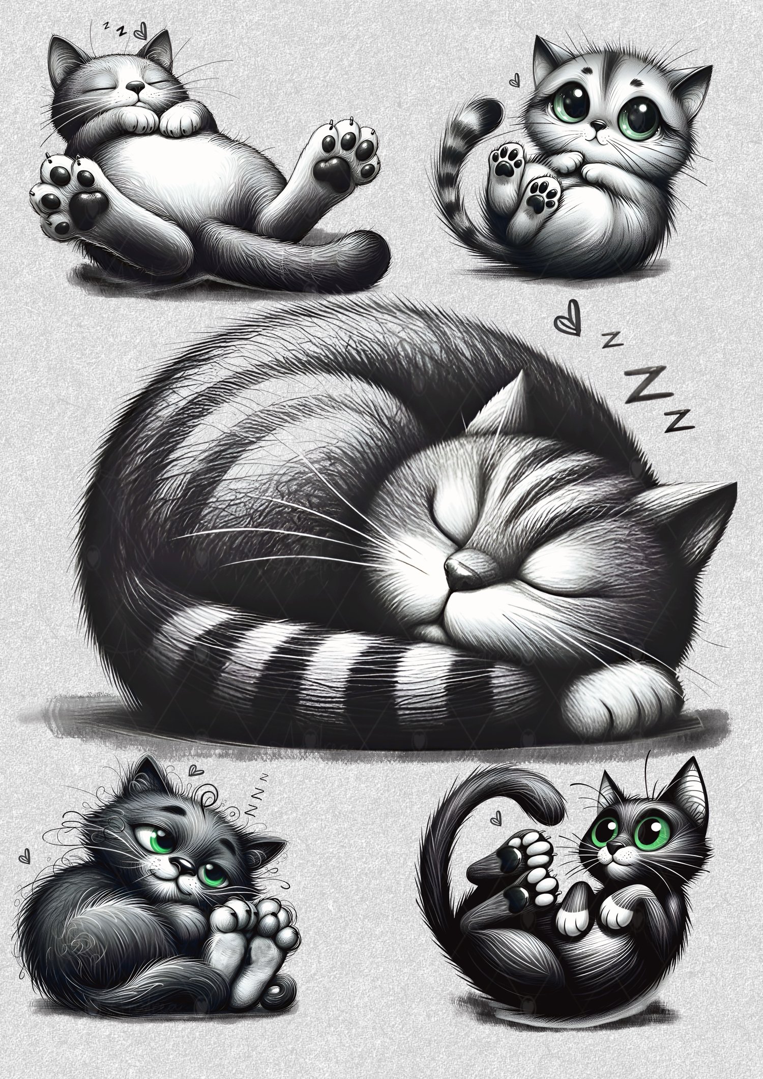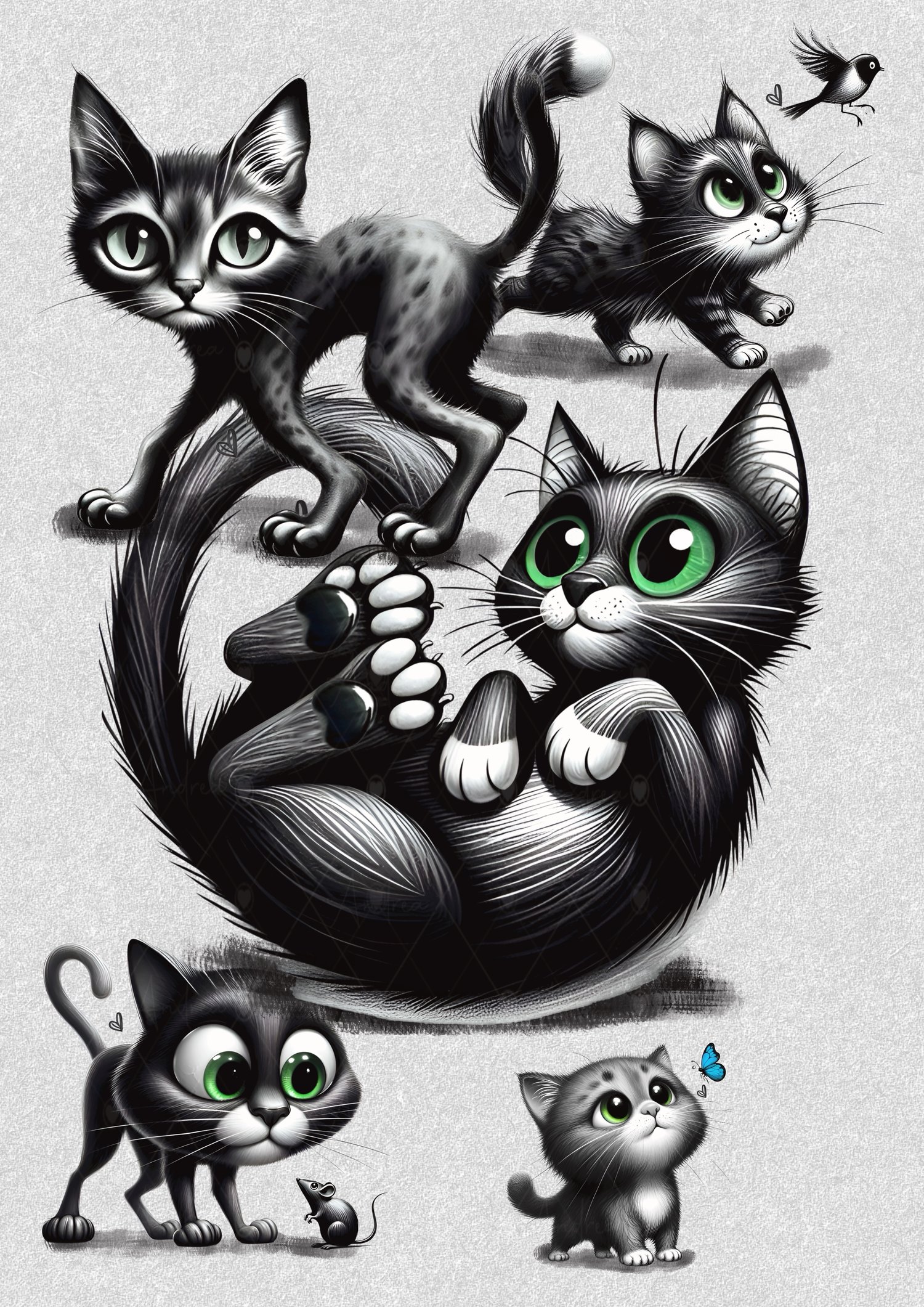 20 Cute, funny, quirky whimsical cats. All monochrome black and white with green eyes, and each one features a tiny heart embellishment. High quality PNGs. Sublimation or print. Instant download.