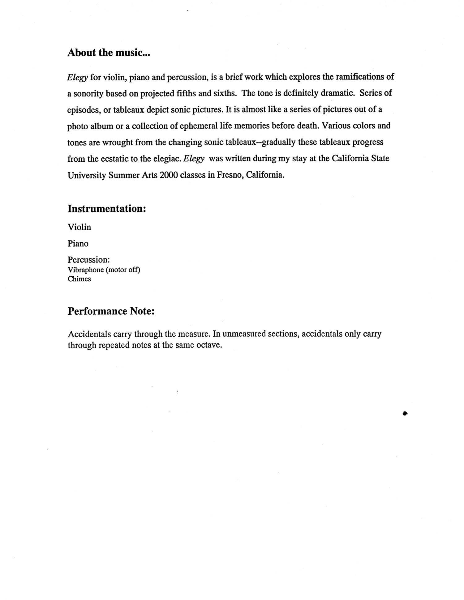 Elegy was not written as a reaction to any specific event, but is pervaded nevertheless by an air of somberness and ritual. It was written while in residence at the CSU Summer Arts Festival in Fresno, CA where it was premiered by violinist Hebe De Champeaux, pianist Jennifer Maybee and percussionist Matthew McClimon in July of 2000.