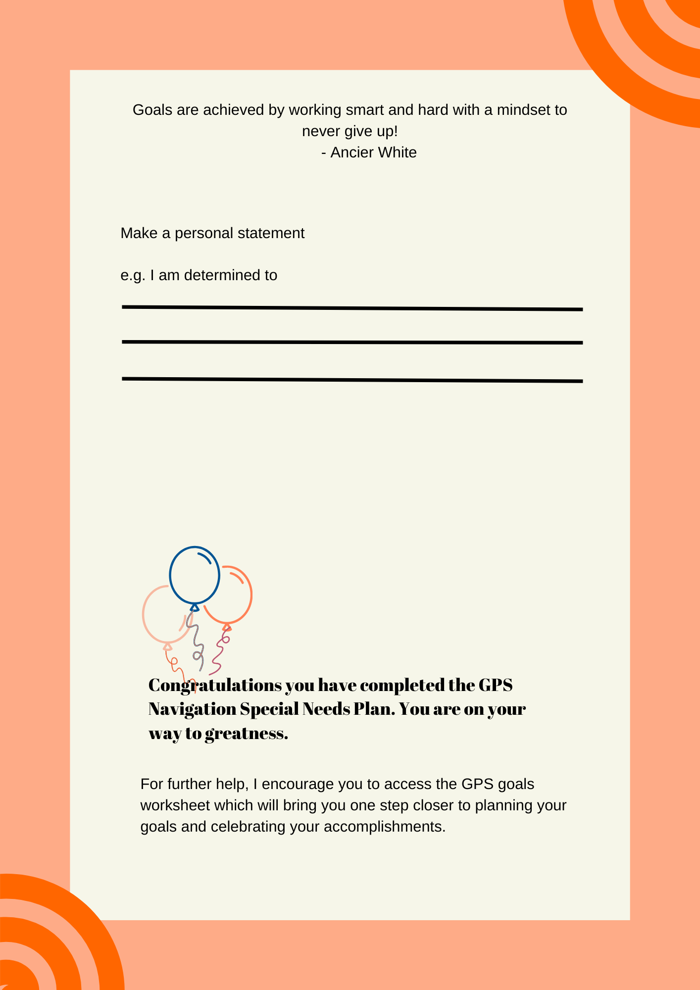 Goals Planning Success Special Needs Workbook is for persons with disabilities that need a guide to help them achieve their goals, and what is most important to them. This workbook is filled will questions that will bring out your passions and drive you towards mapping out your route and maintaining and building on your success. Removing the barriers in your mind and motivating you to achieve your dreams and goals one at a time.