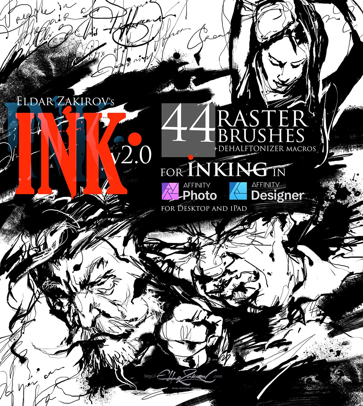 INK. for Affinity Photo & Designer: 44 raster Brushes + Dehalftonizer macros — for desktop & iPad