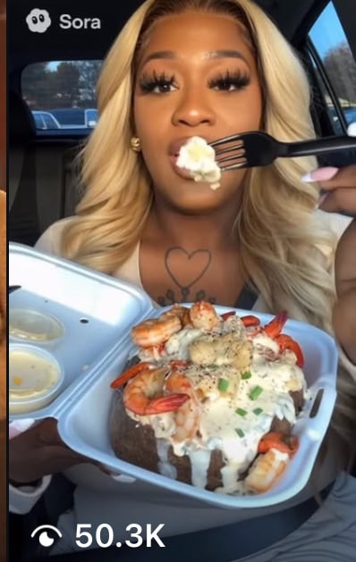 • Influencer & Vlog Scenarios: Several prompts are tailored for creating social media content, featuring a "foodie influencer" with "full glam" makeup doing mukbangs, car-based food reviews, or home-cooked meal reviews for her followers.